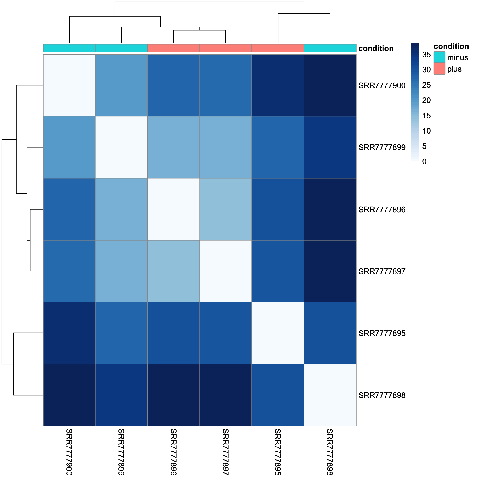 Let’s create a heatmap based on the distance between pair-wise sample expression profiles. This is another vantage point of how similar and dissimilar the samples are from one another. To get started, we actually want a plain matrix, with out a column for the gene IDs, as we did for the boxplot.