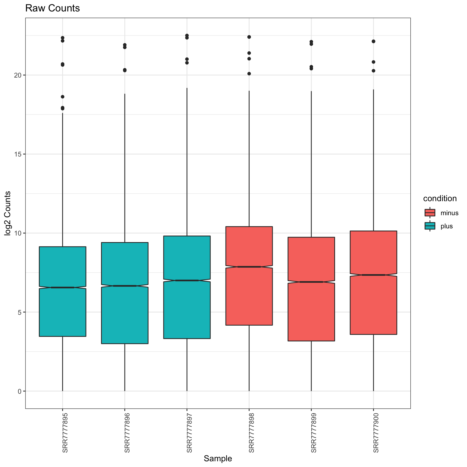 raw_boxplot = ggplot(tidy_raw, aes(x = sample, y = log2(counts), fill = condition)) +