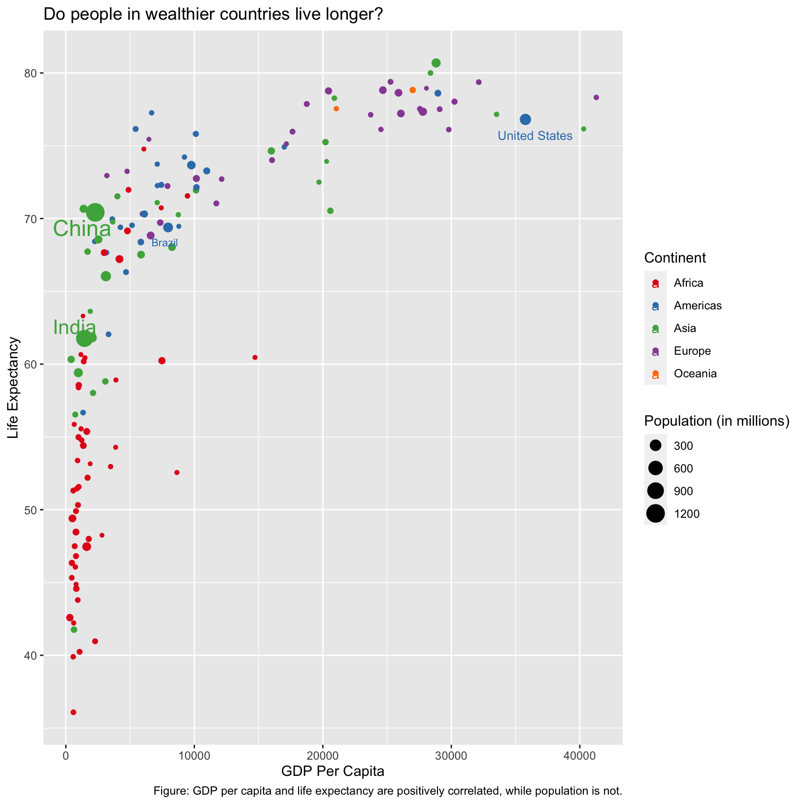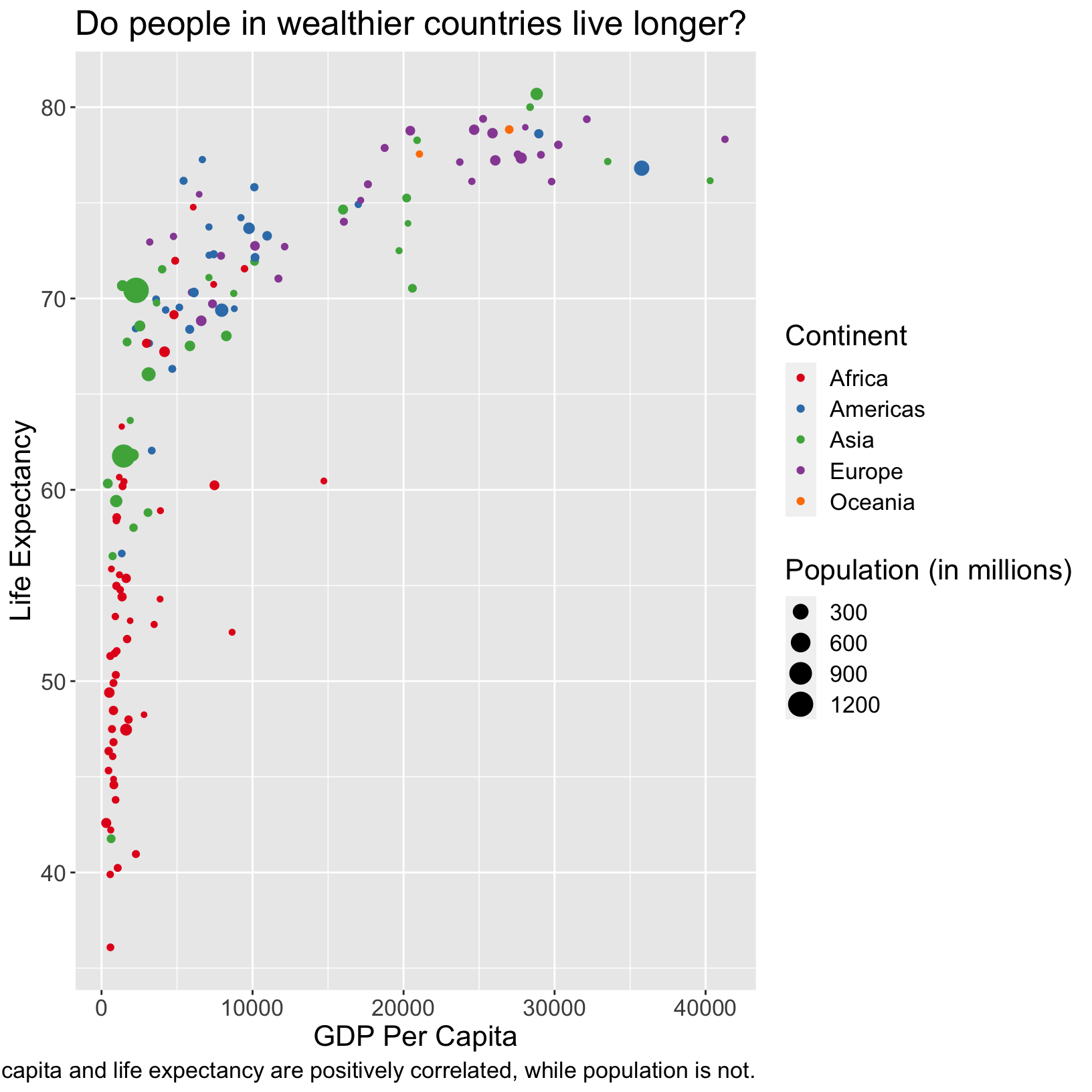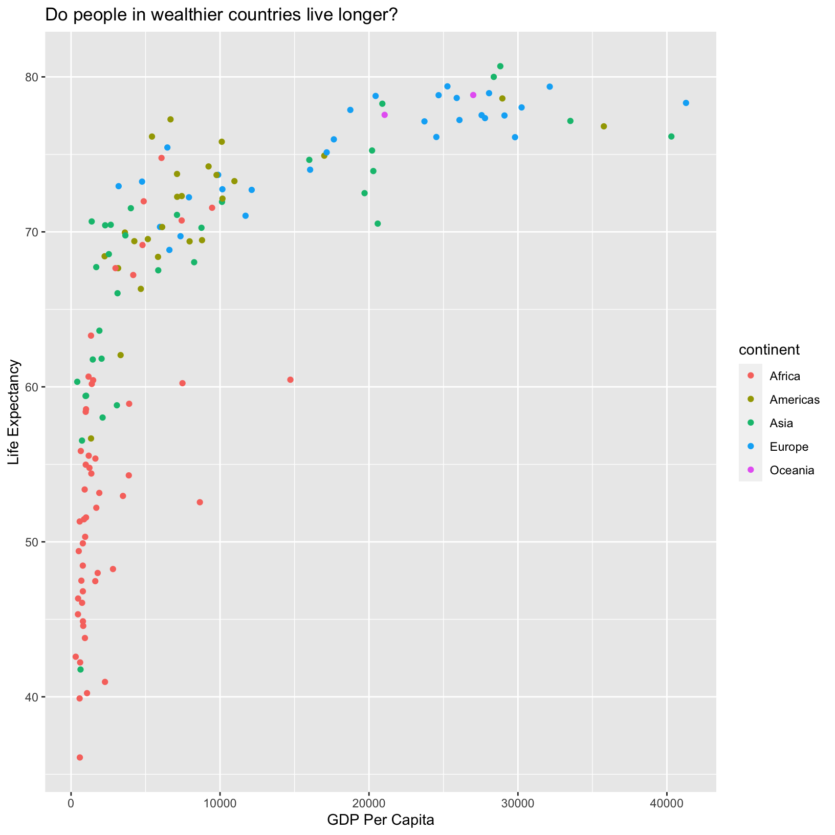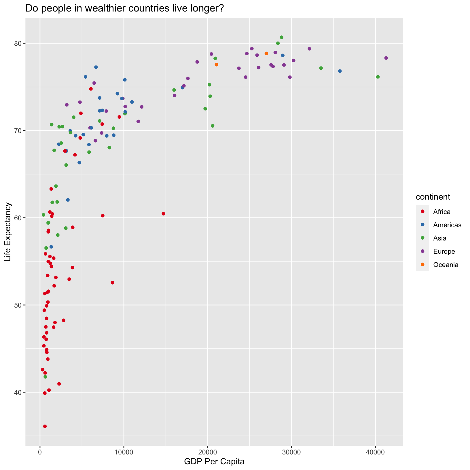 With the continents shown by color, we immediately pick out that African countries tend to have lower life expectancy than other countries. Of course, there are African countries (red points) with life expectancies similar to wealthier countries, suggesting that GDP per capita does not tell the full story about health, as we might have already guessed.