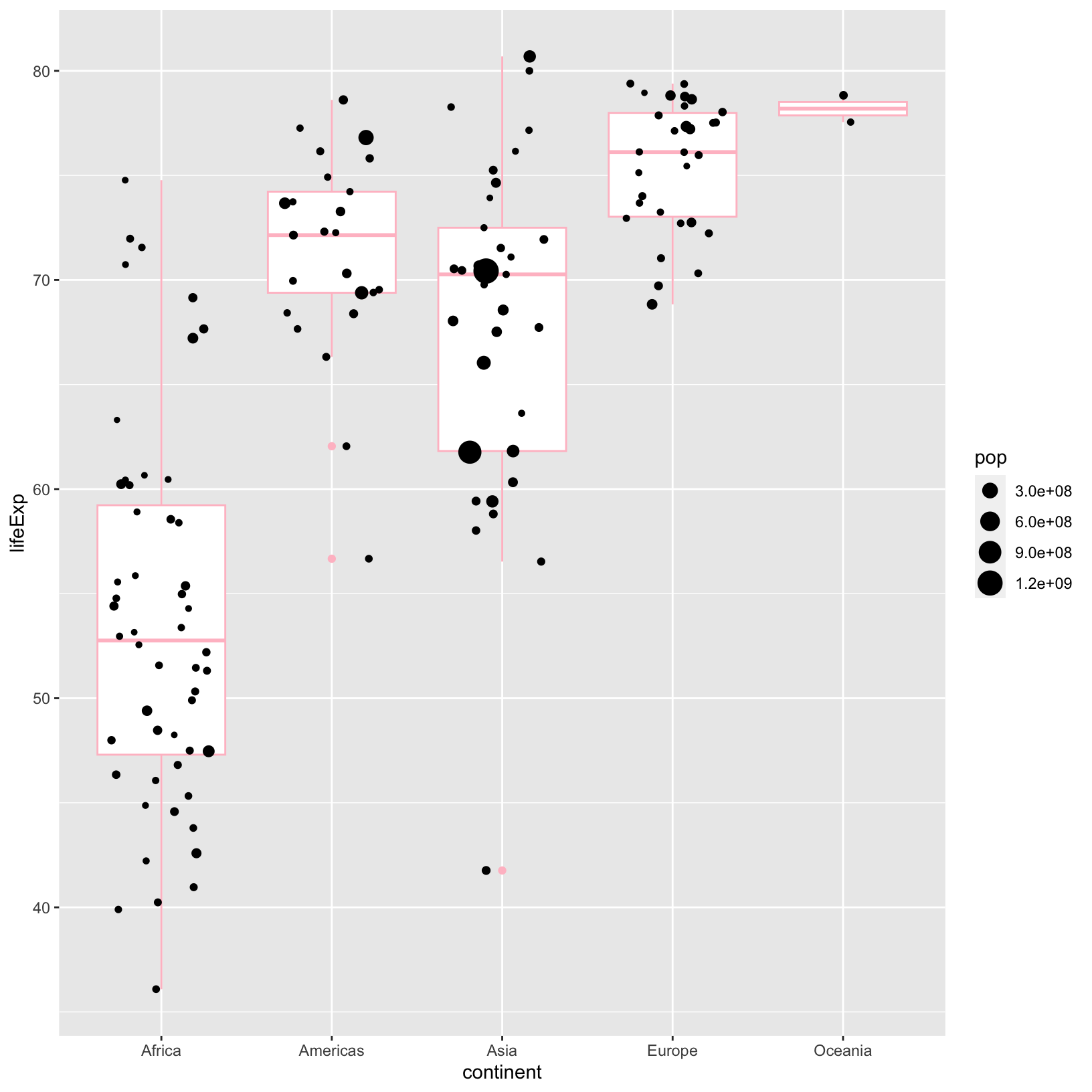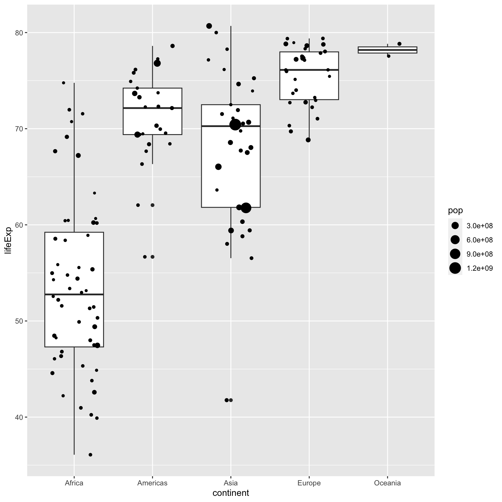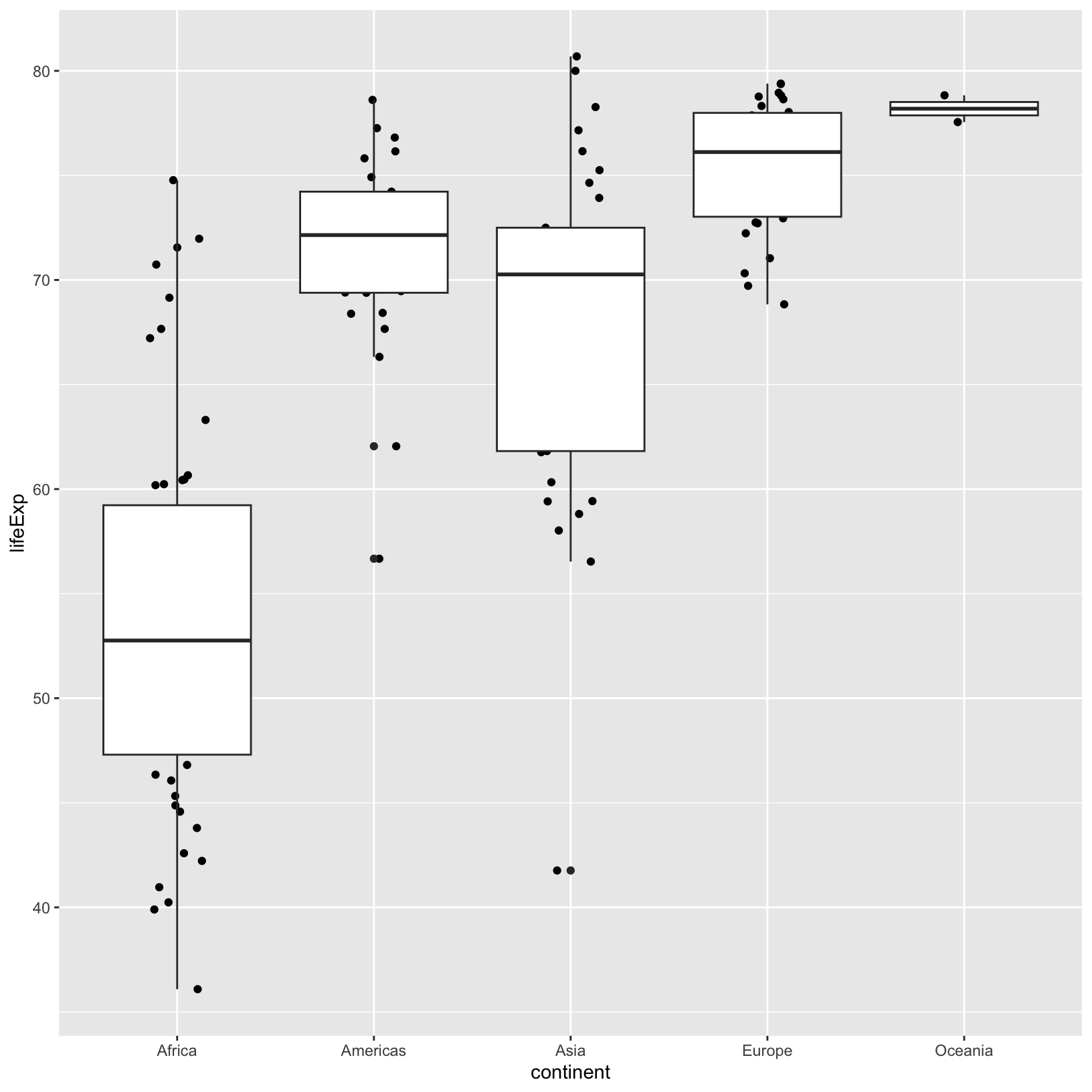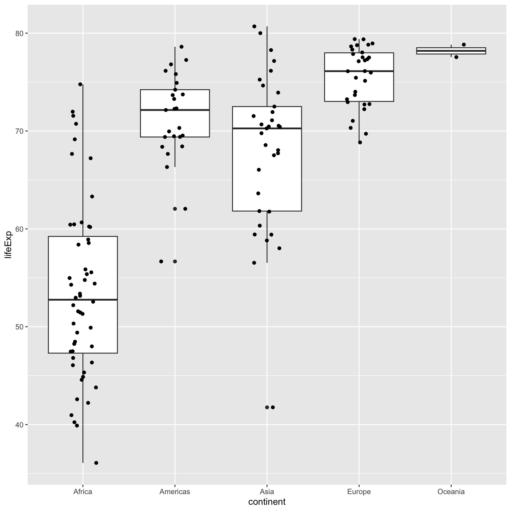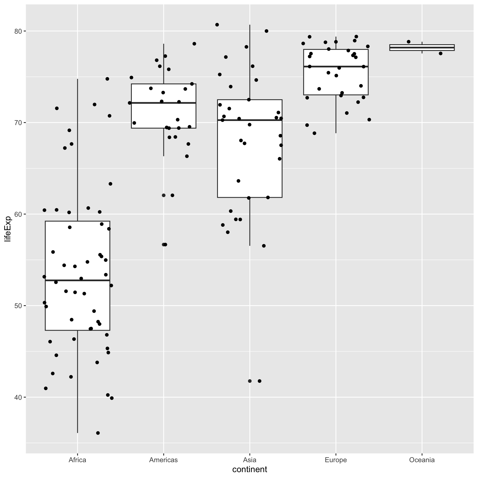 With the continents shown by color, we immediately pick out that African countries tend to have lower life expectancy than other countries. Of course, there are African countries (red points) with life expectancies similar to wealthier countries, suggesting that GDP per capita does not tell the full story about health, as we might have already guessed.