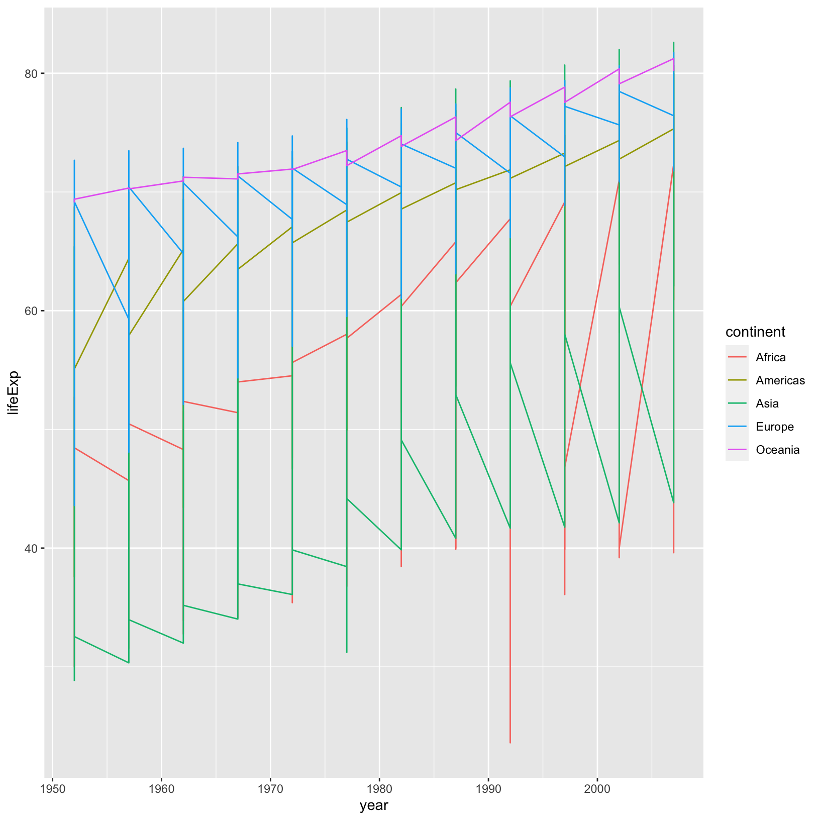 Is this plot clear? Might it be improved by splitting up the continents into their own plots? Below is a plot which pulls apart the trends on the different continents, while still plotting each country individually. Try to write the code that would generate it.
