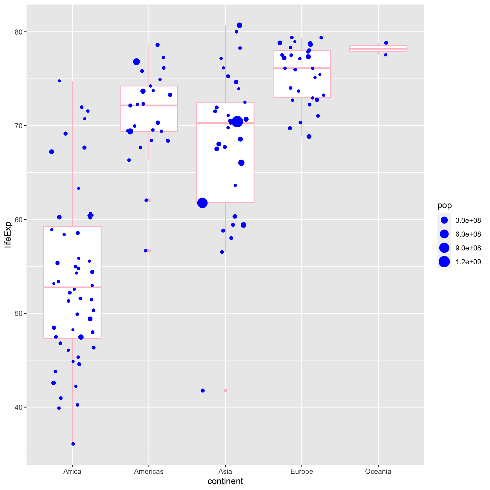 geom_point(aes(color = continent, size = pop/1000000)) +
