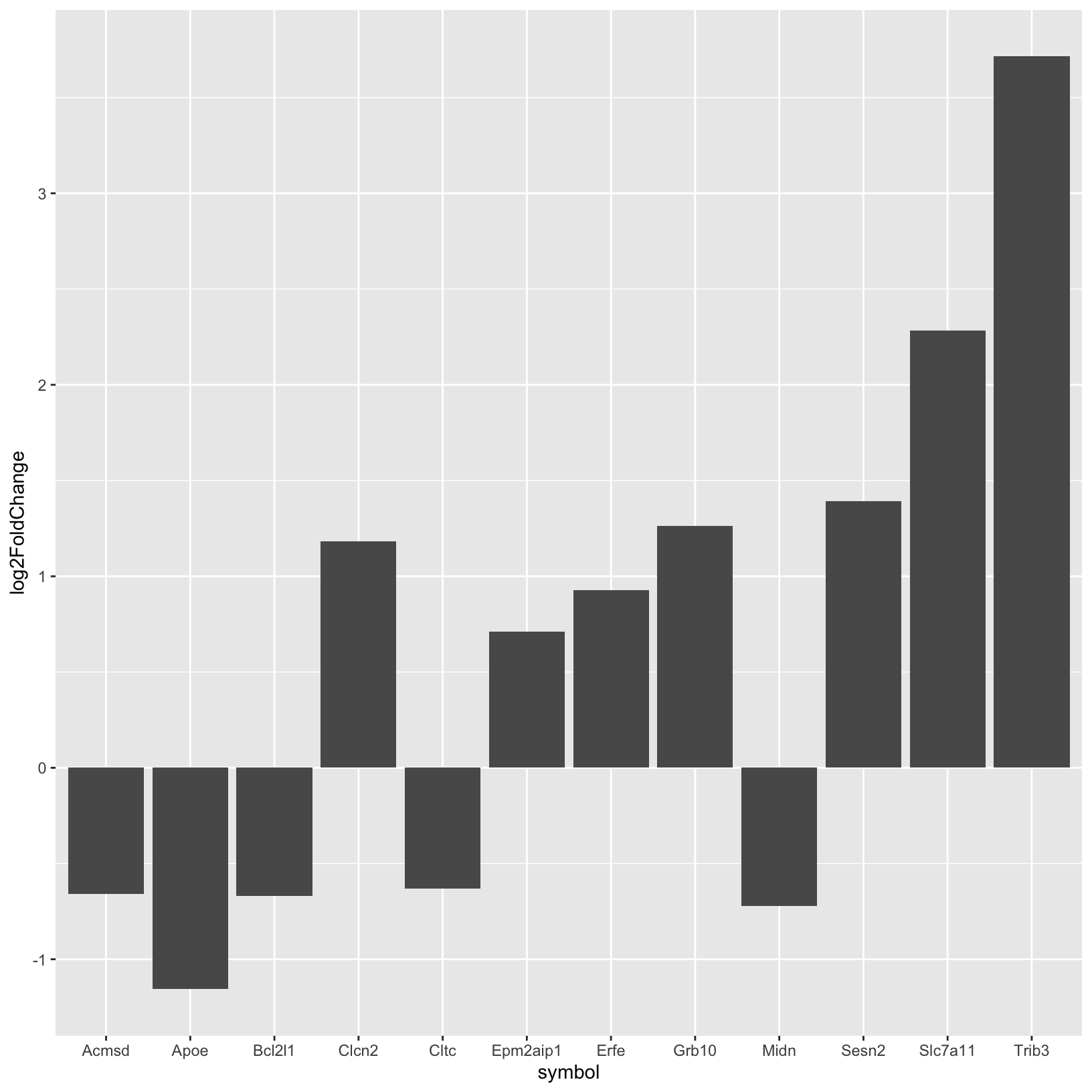 Let’s start by using the subsetted table to create a simple barplot of the fold-change values for each gene: