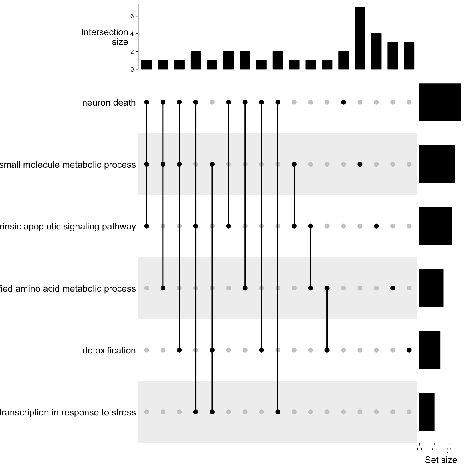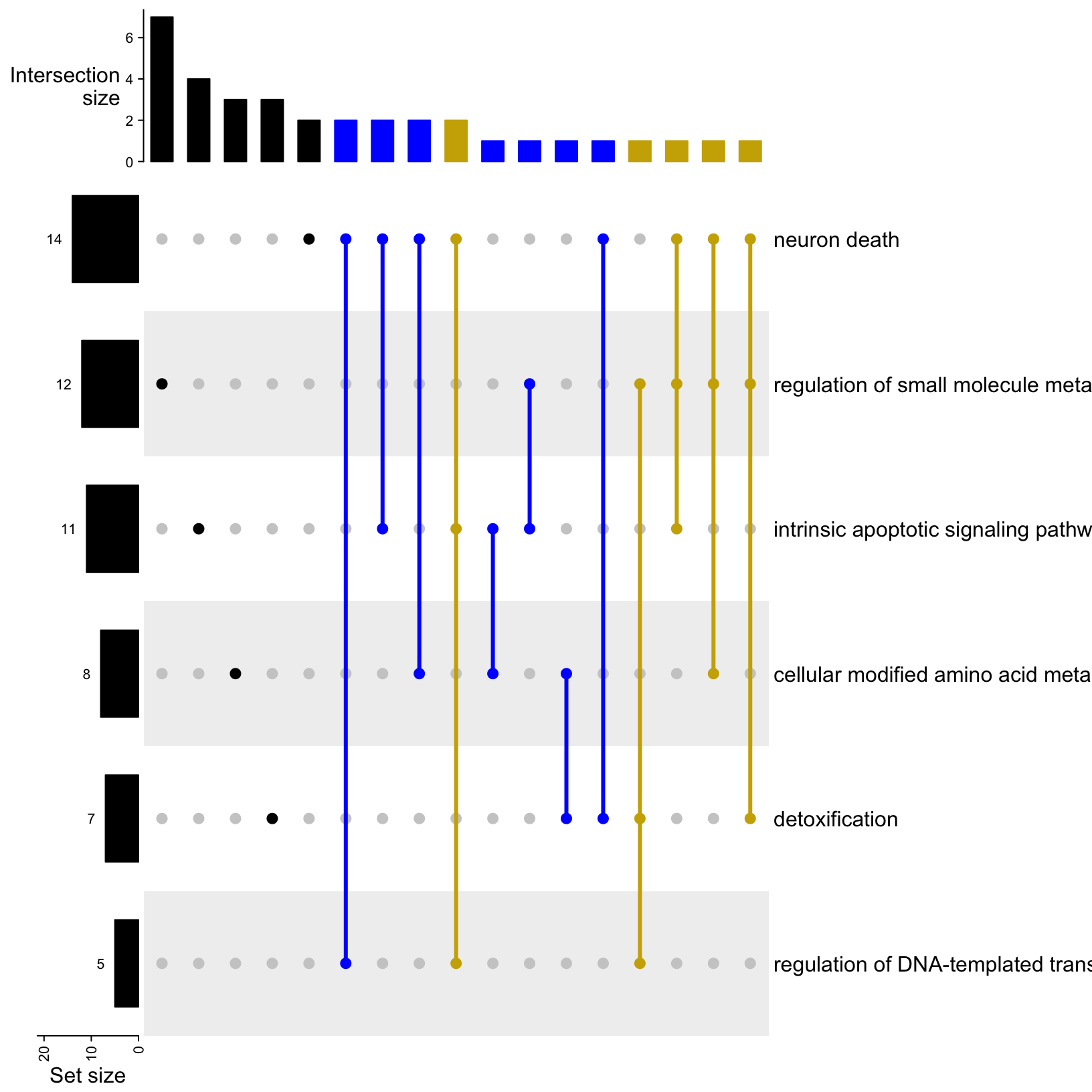 Now we have the GO term dots connected with a thicker line to indicate the combination and a color designated for each degree of intersection (black = unique, blue = shared by two terms, gold = shared by three terms). We also have the intersections sorted by size and the set size bar moved to the left with the values added.