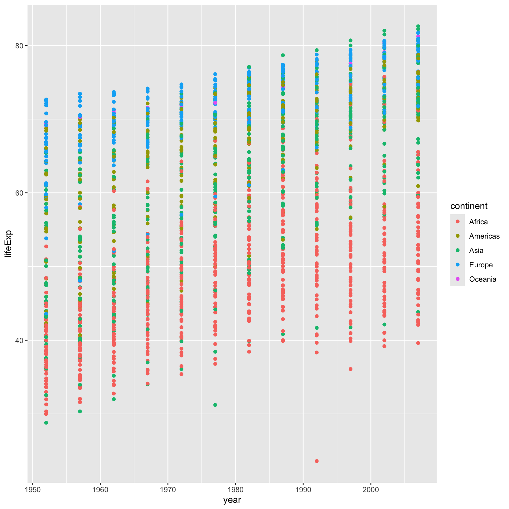 We’ve made excellent progress on our first plot, and without even having to write very much code! There is much more we can do visually to understand what the data might be telling us in addition to the general trend we’ve already observed. For example, we can use different colors for each continent to understand how continent affects this relationship: