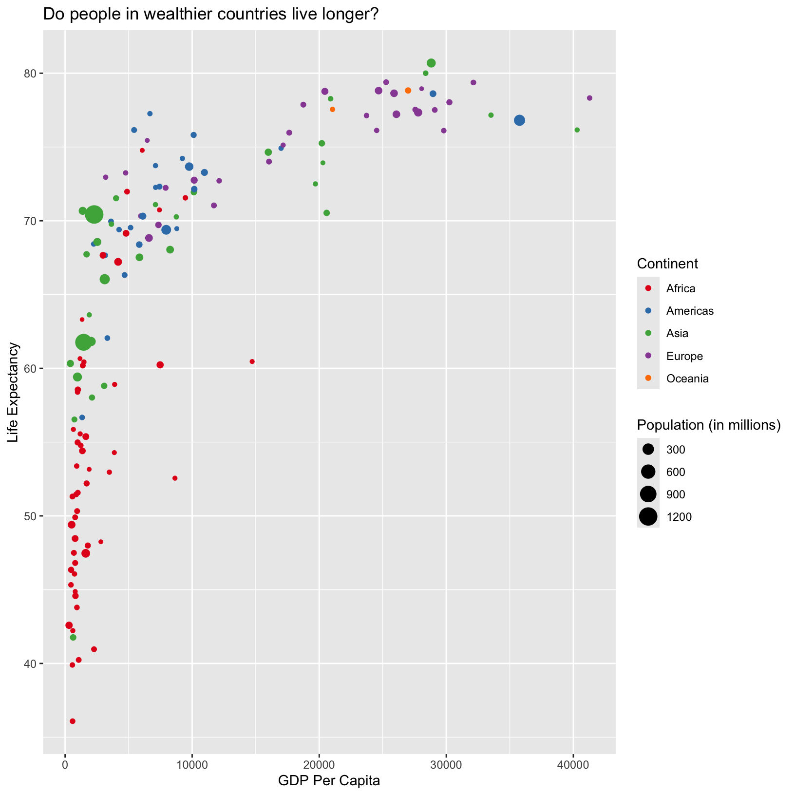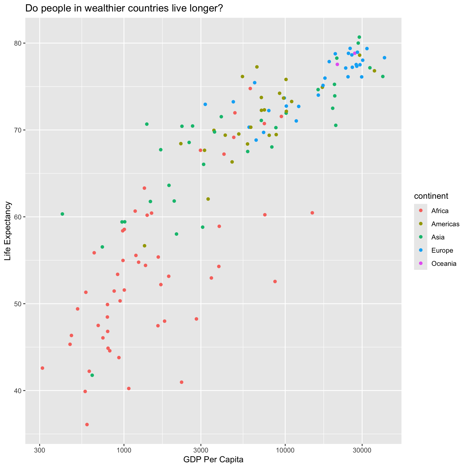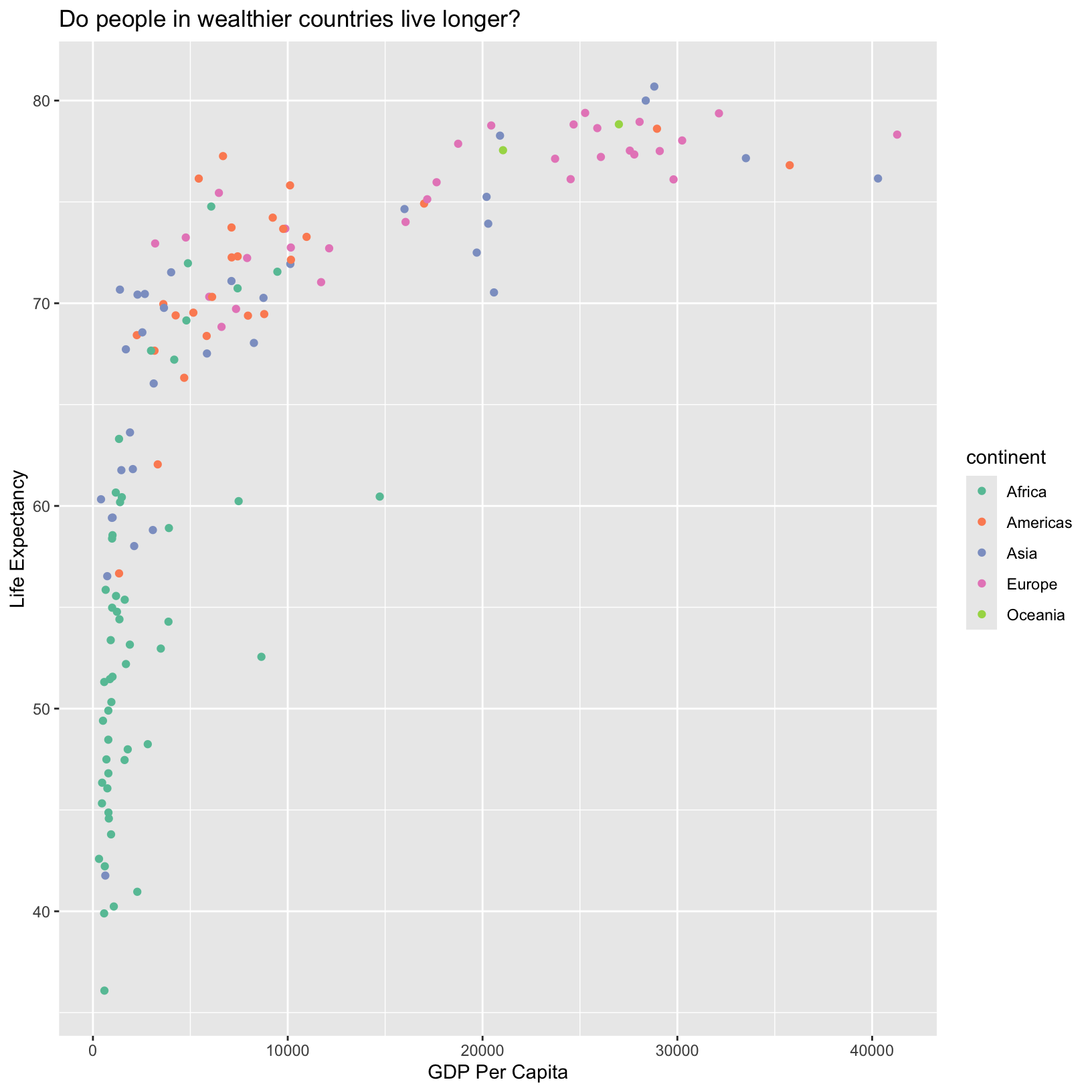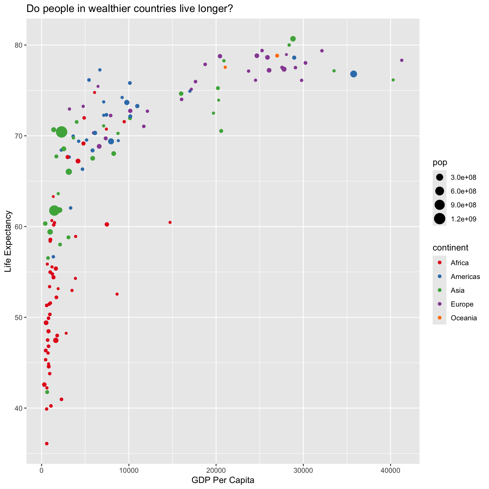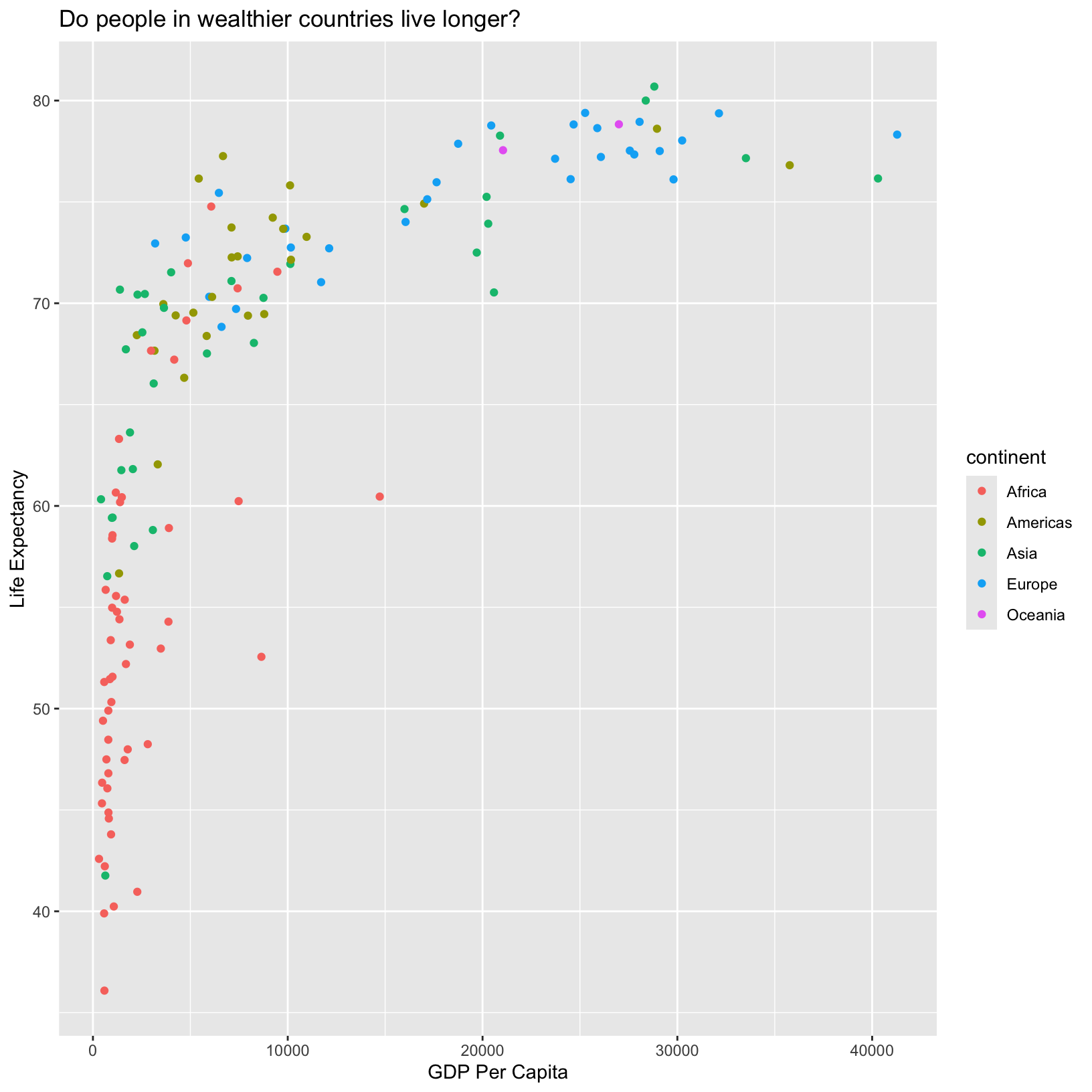 With the continents shown by color, we immediately pick out that African countries tend to have lower life expectancy than other countries. Of course, there are African countries (red points) with life expectancies similar to wealthier countries, suggesting that GDP per capita does not tell the full story about health, as we might have already guessed.
