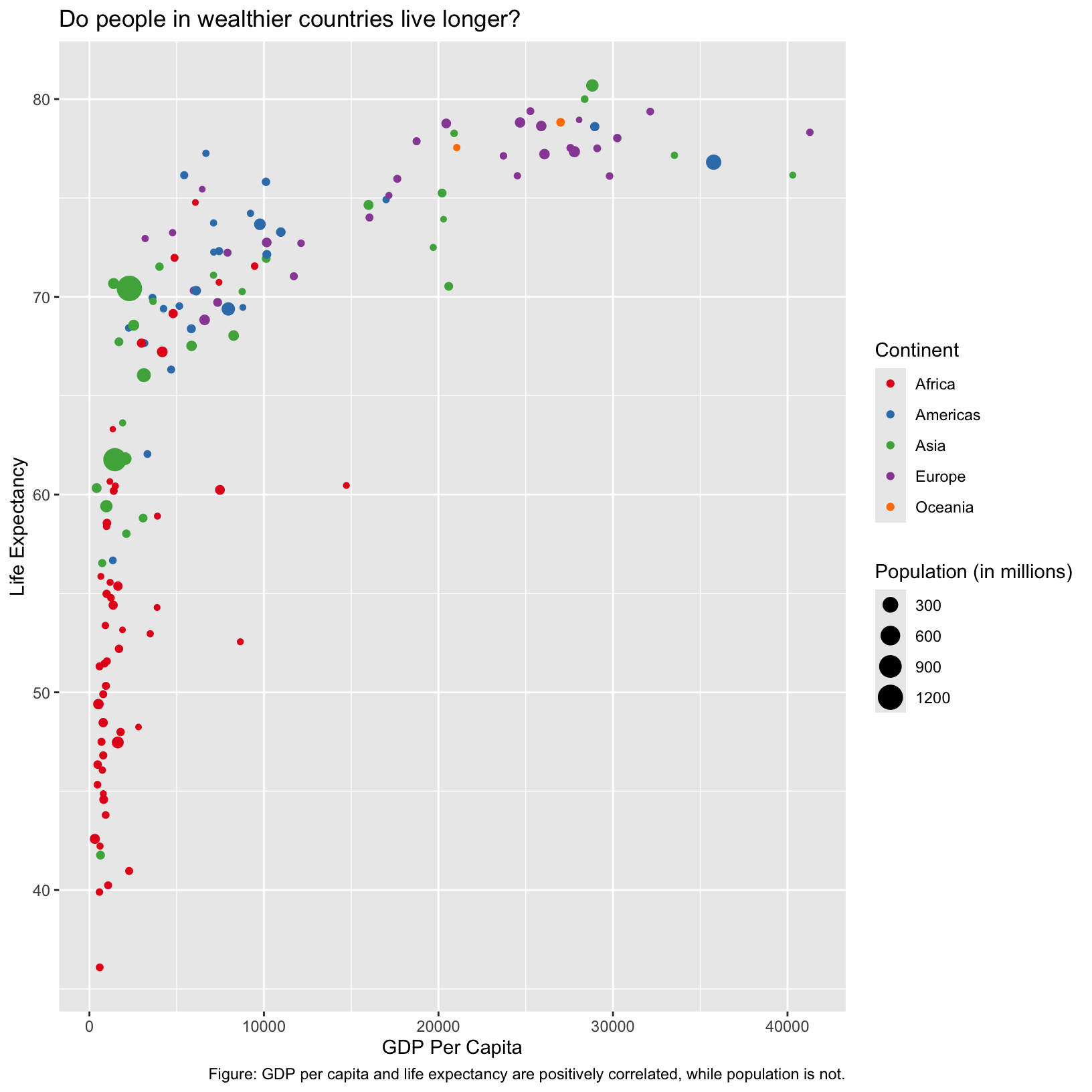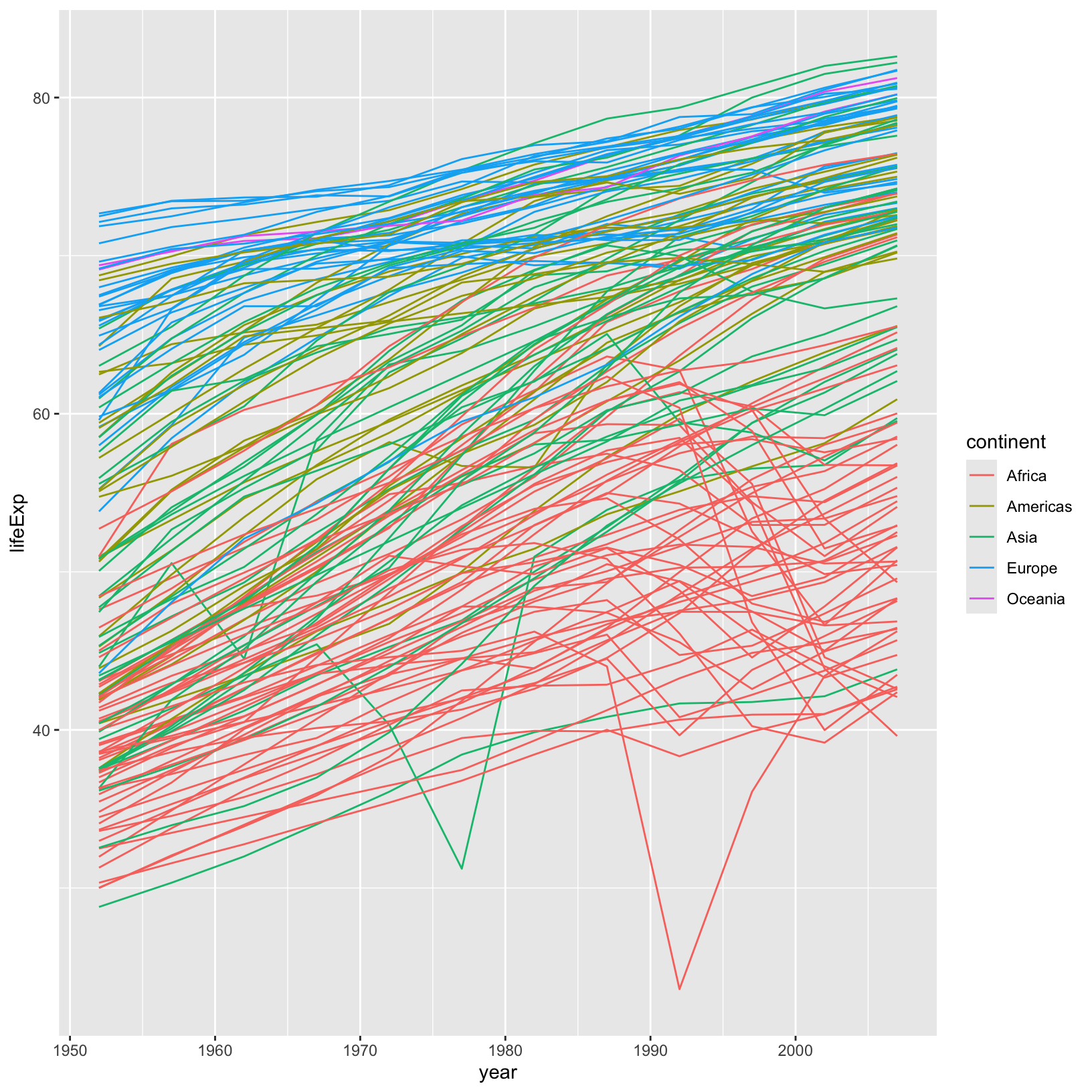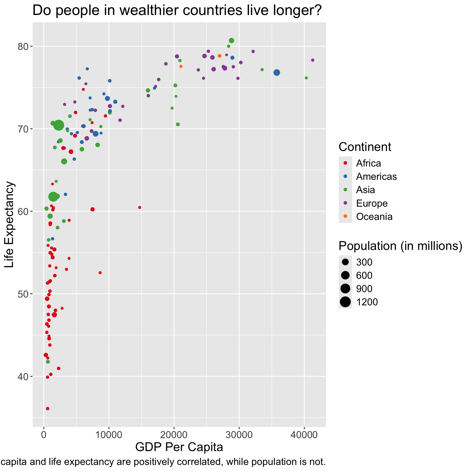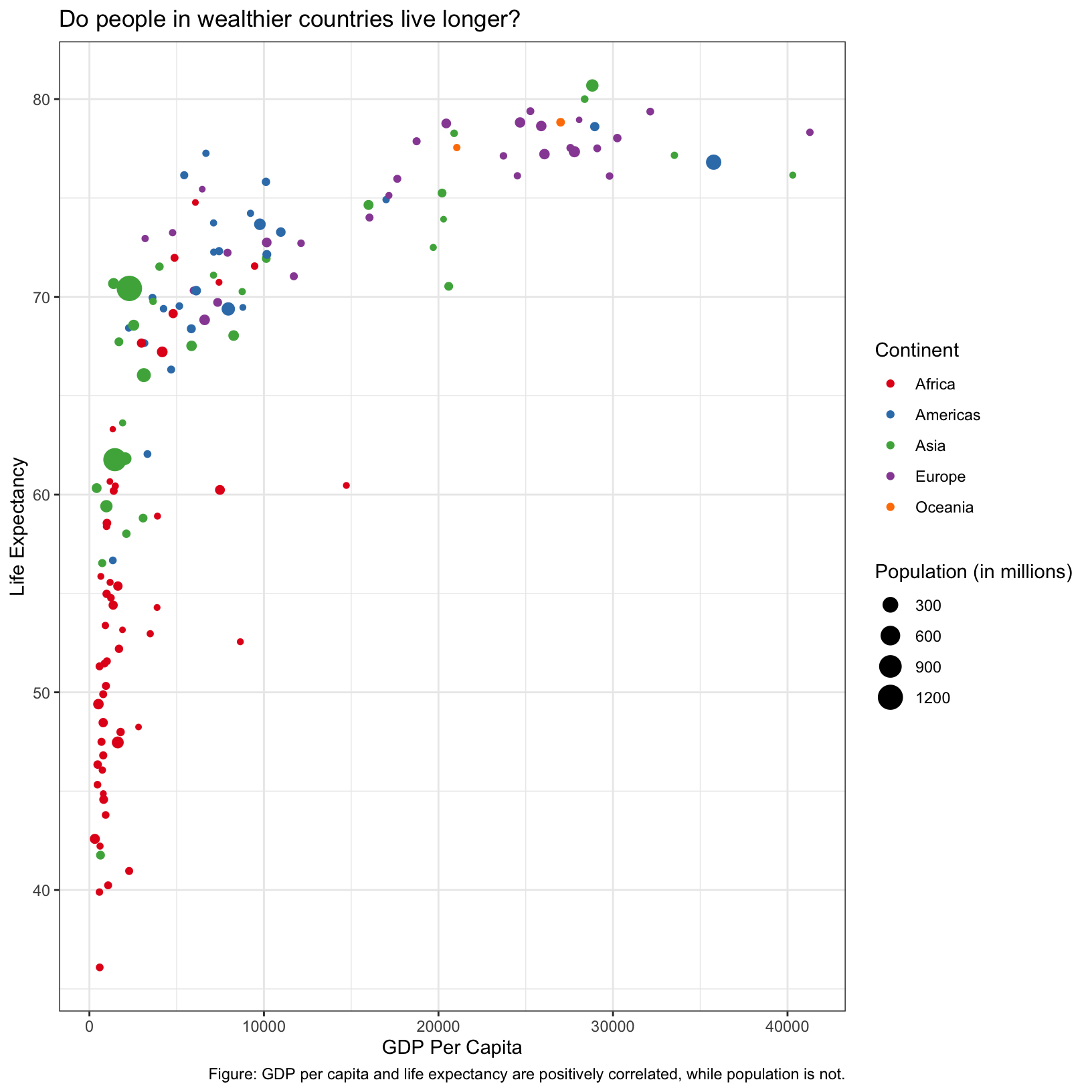 With the continents shown by color, we immediately pick out that African countries tend to have lower life expectancy than other countries. Of course, there are African countries (red points) with life expectancies similar to wealthier countries, suggesting that GDP per capita does not tell the full story about health, as we might have already guessed.