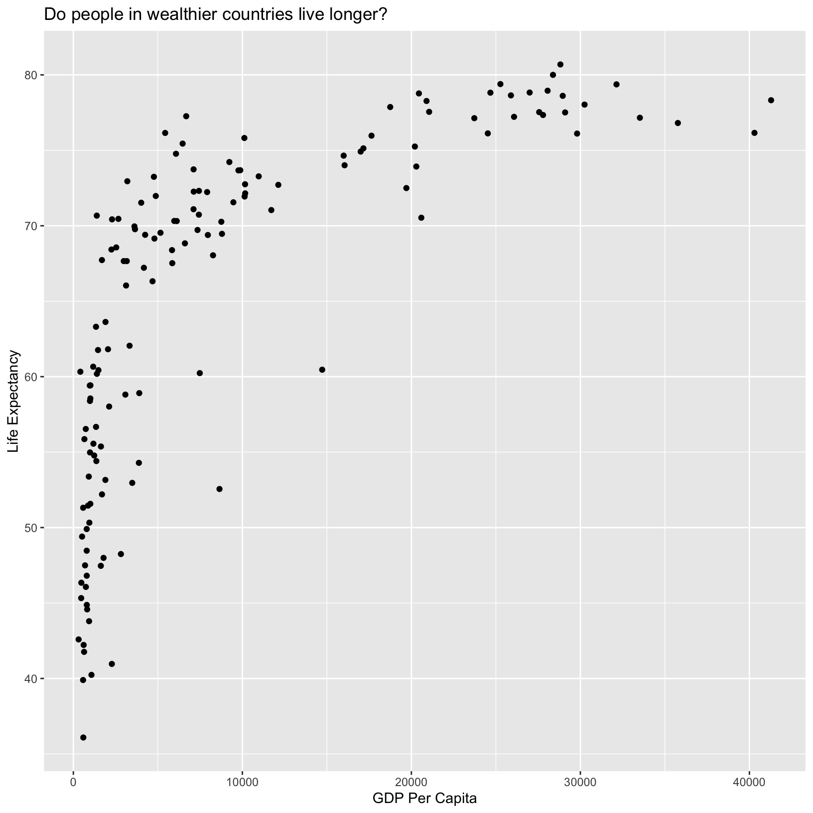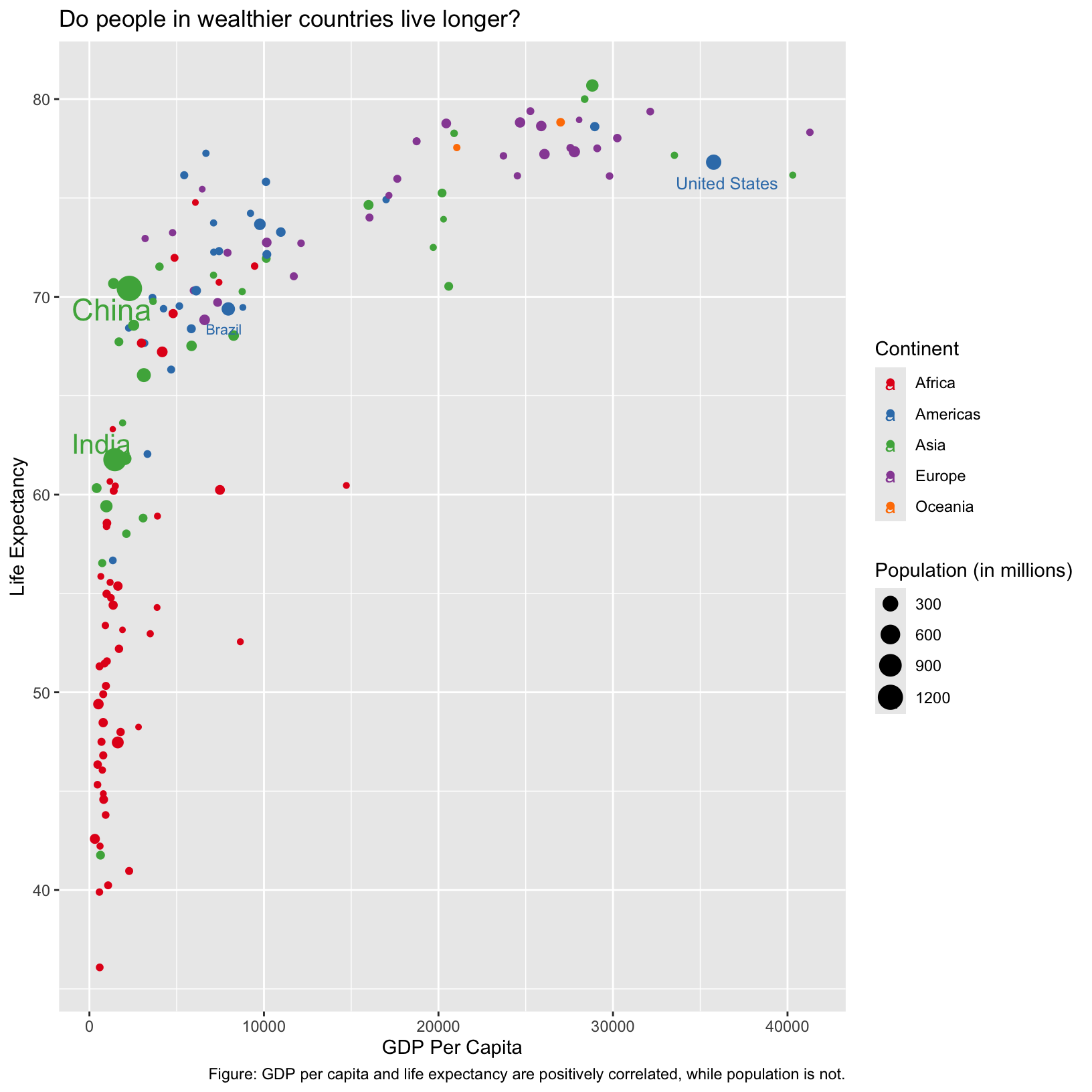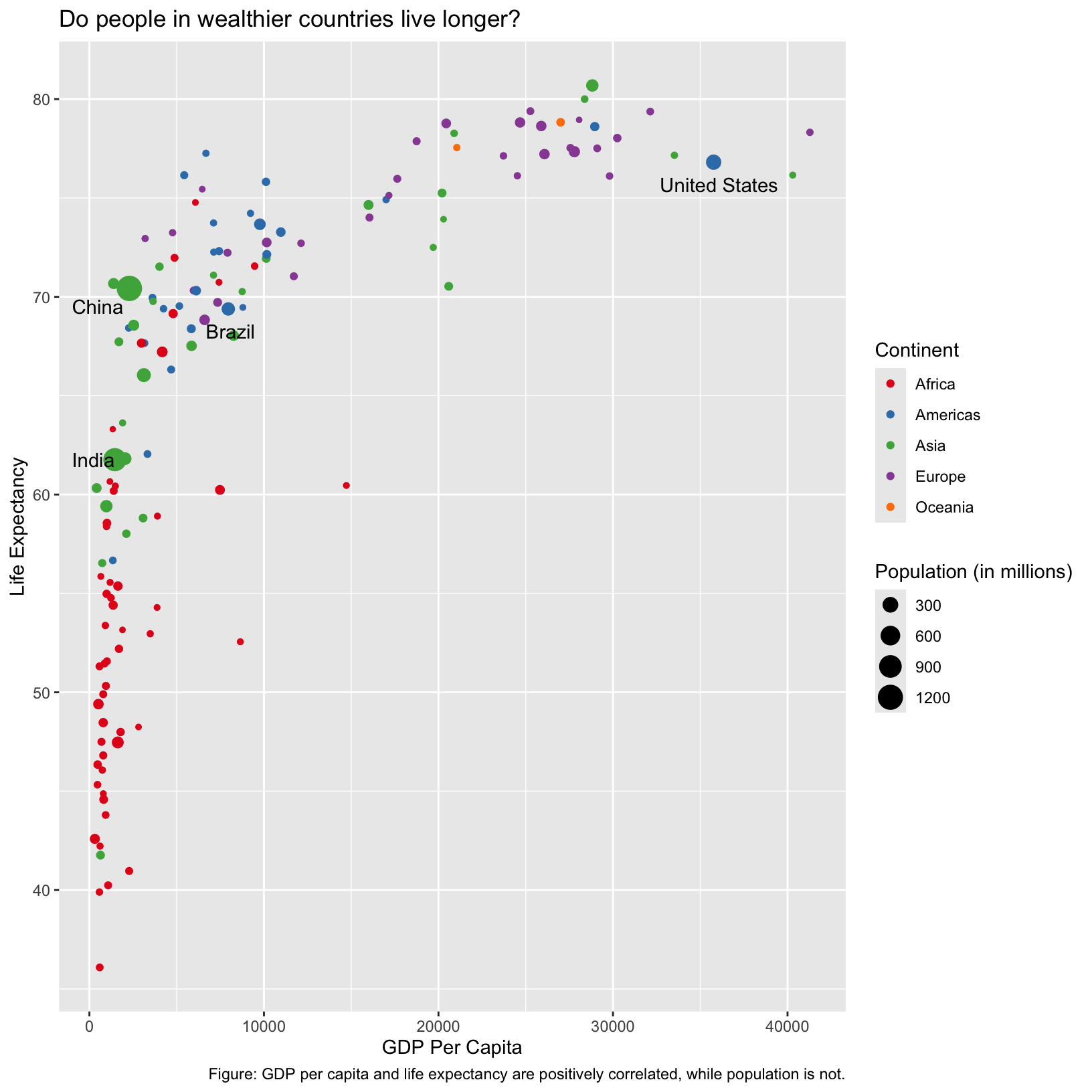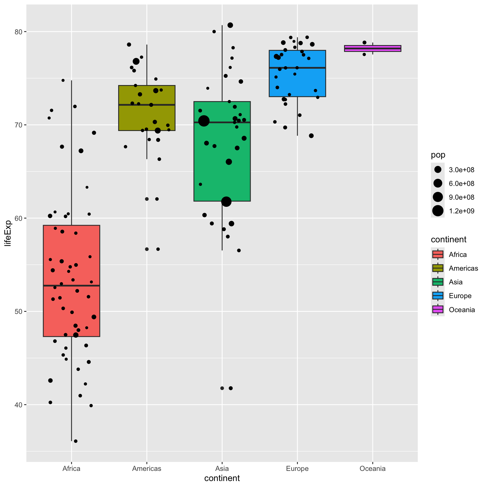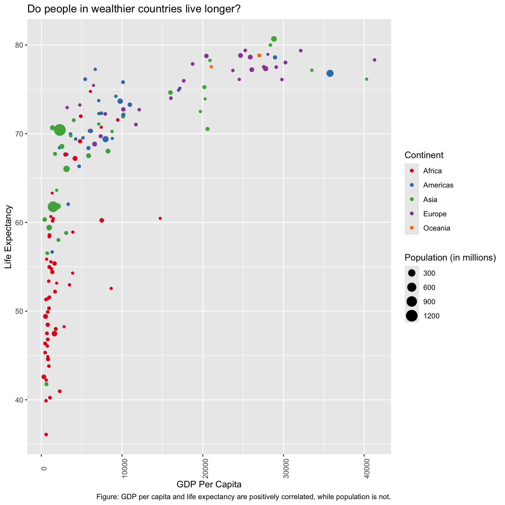 With the continents shown by color, we immediately pick out that African countries tend to have lower life expectancy than other countries. Of course, there are African countries (red points) with life expectancies similar to wealthier countries, suggesting that GDP per capita does not tell the full story about health, as we might have already guessed.