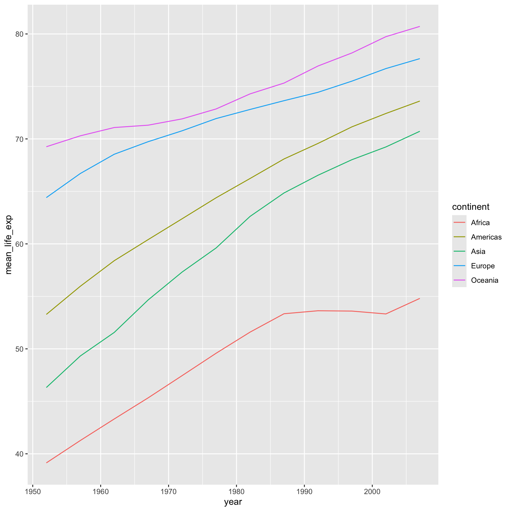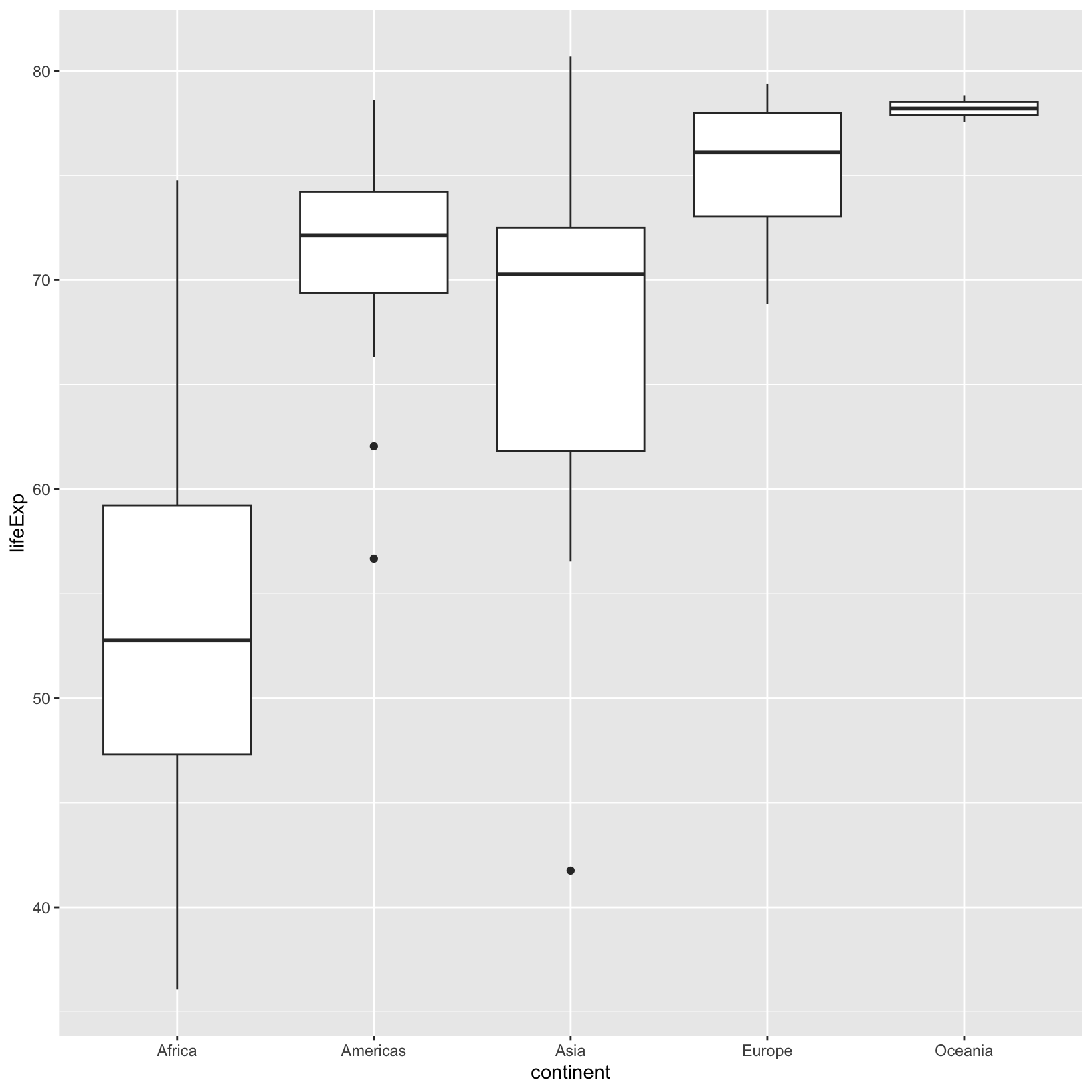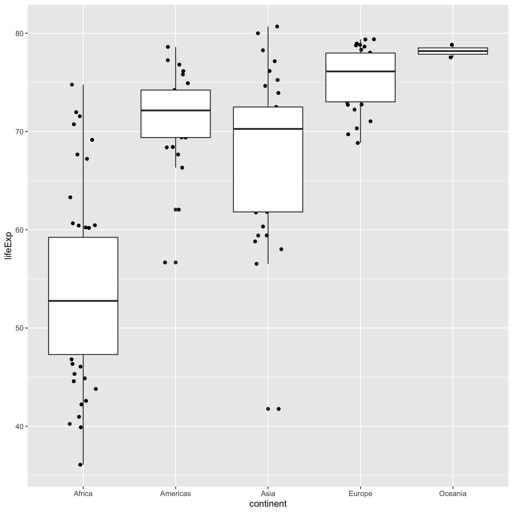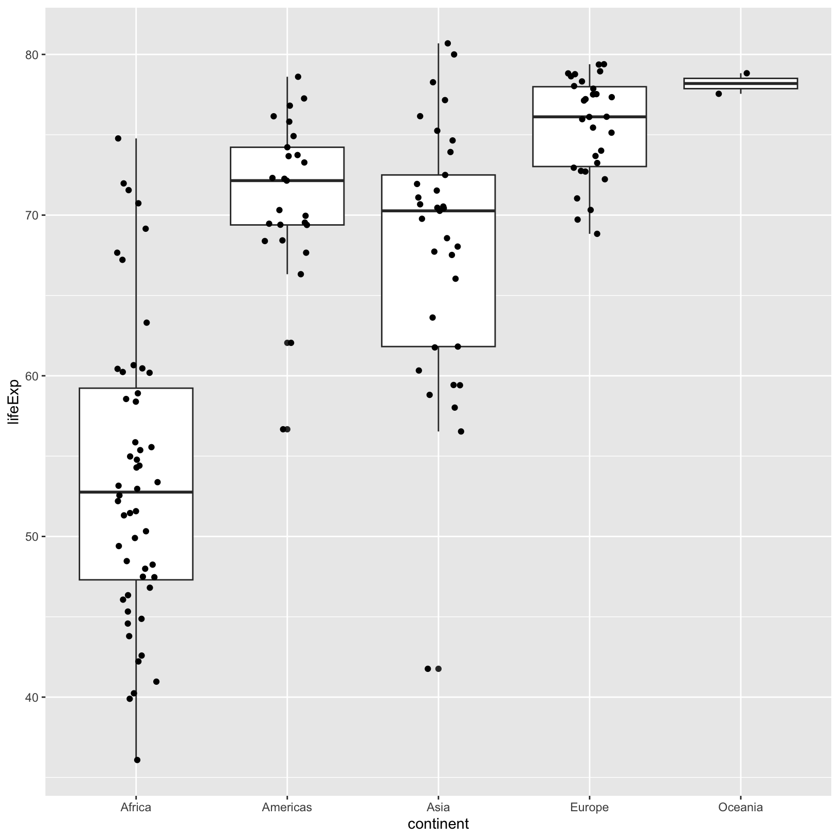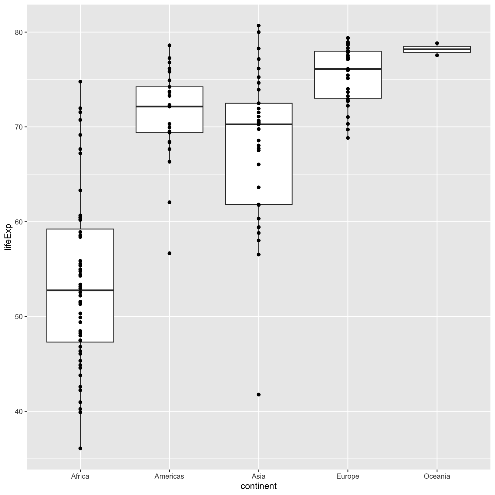 With the continents shown by color, we immediately pick out that African countries tend to have lower life expectancy than other countries. Of course, there are African countries (red points) with life expectancies similar to wealthier countries, suggesting that GDP per capita does not tell the full story about health, as we might have already guessed.
