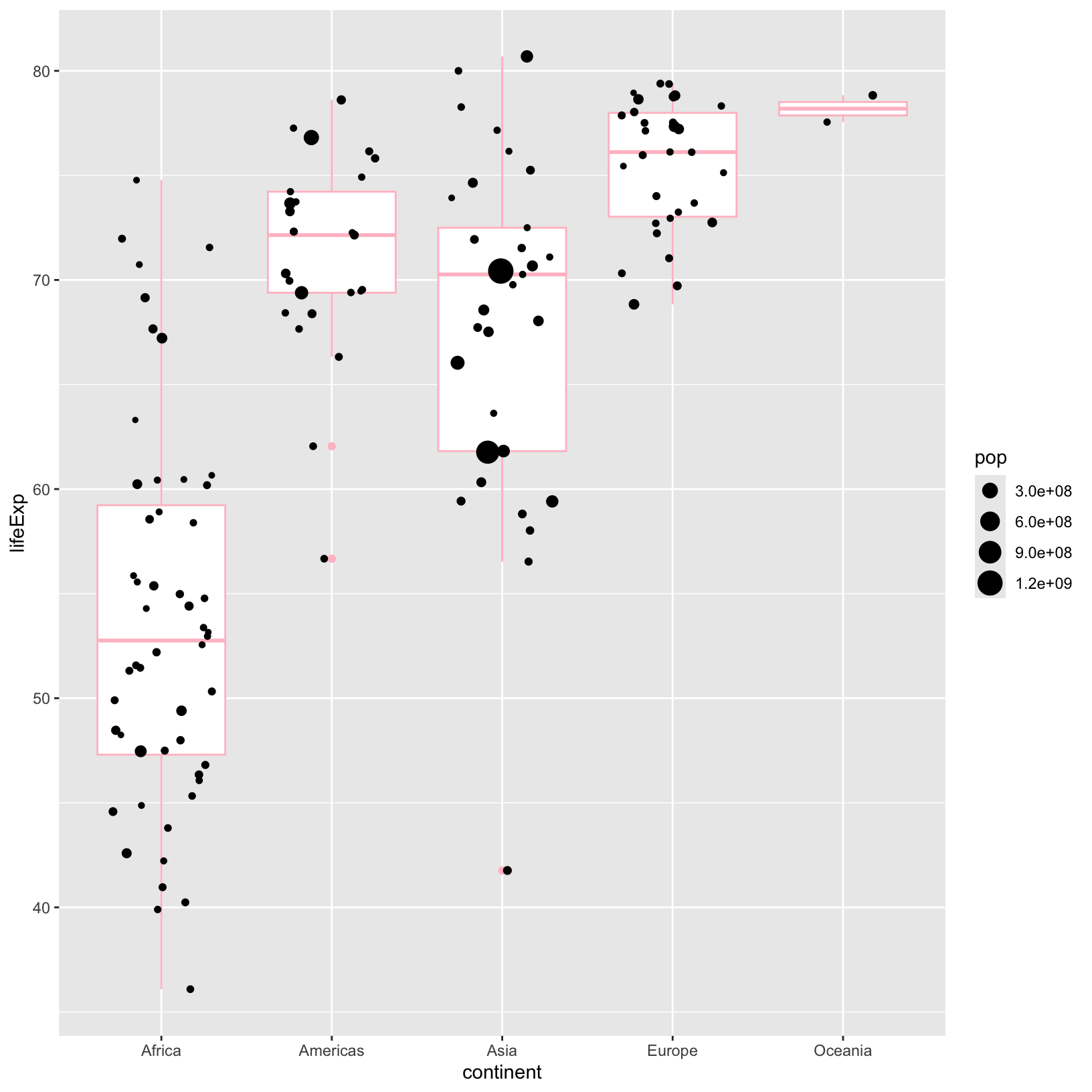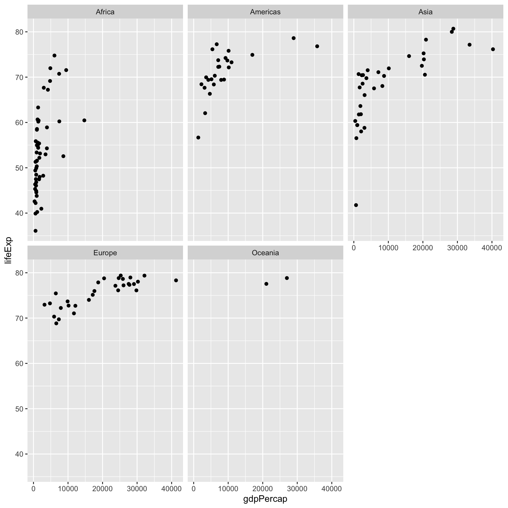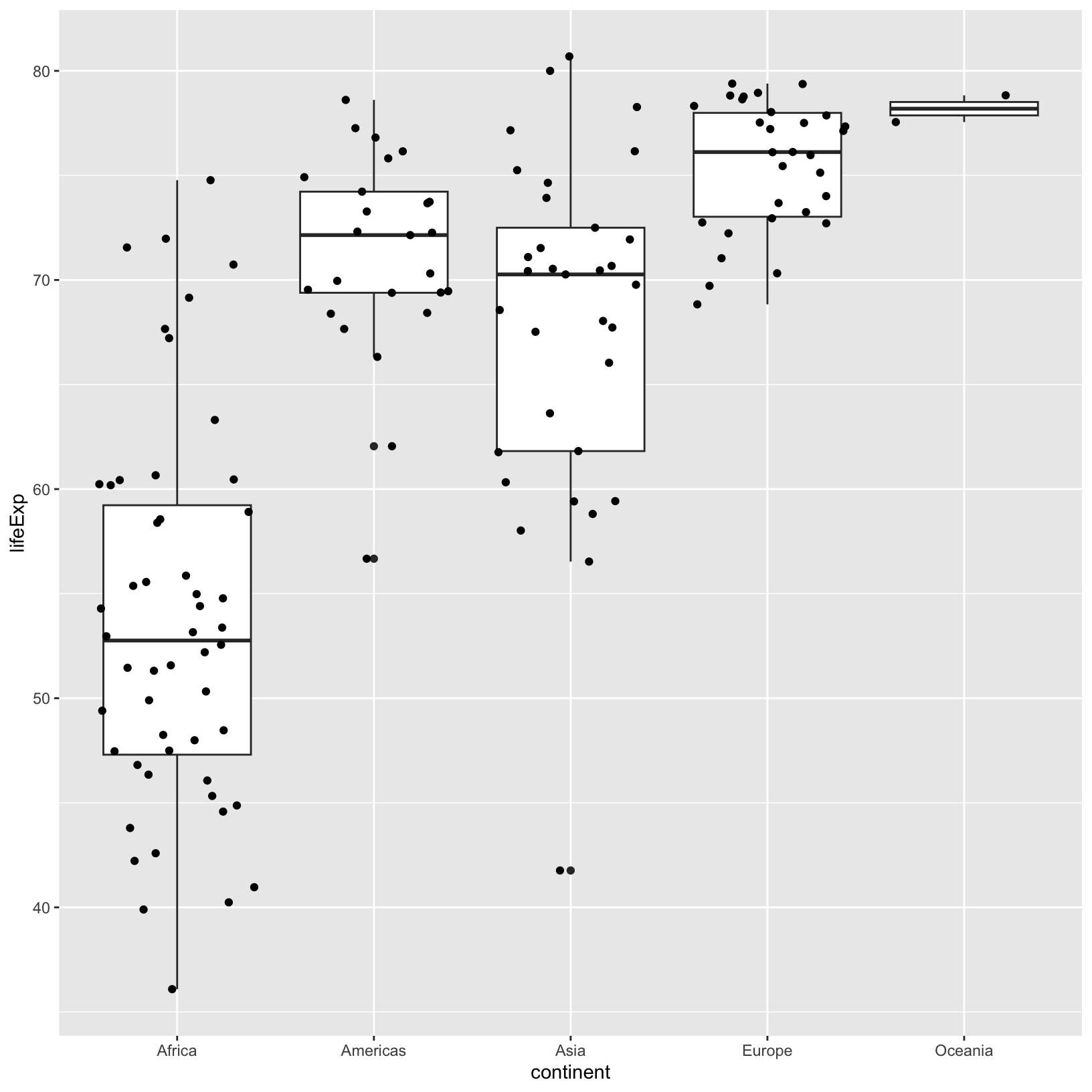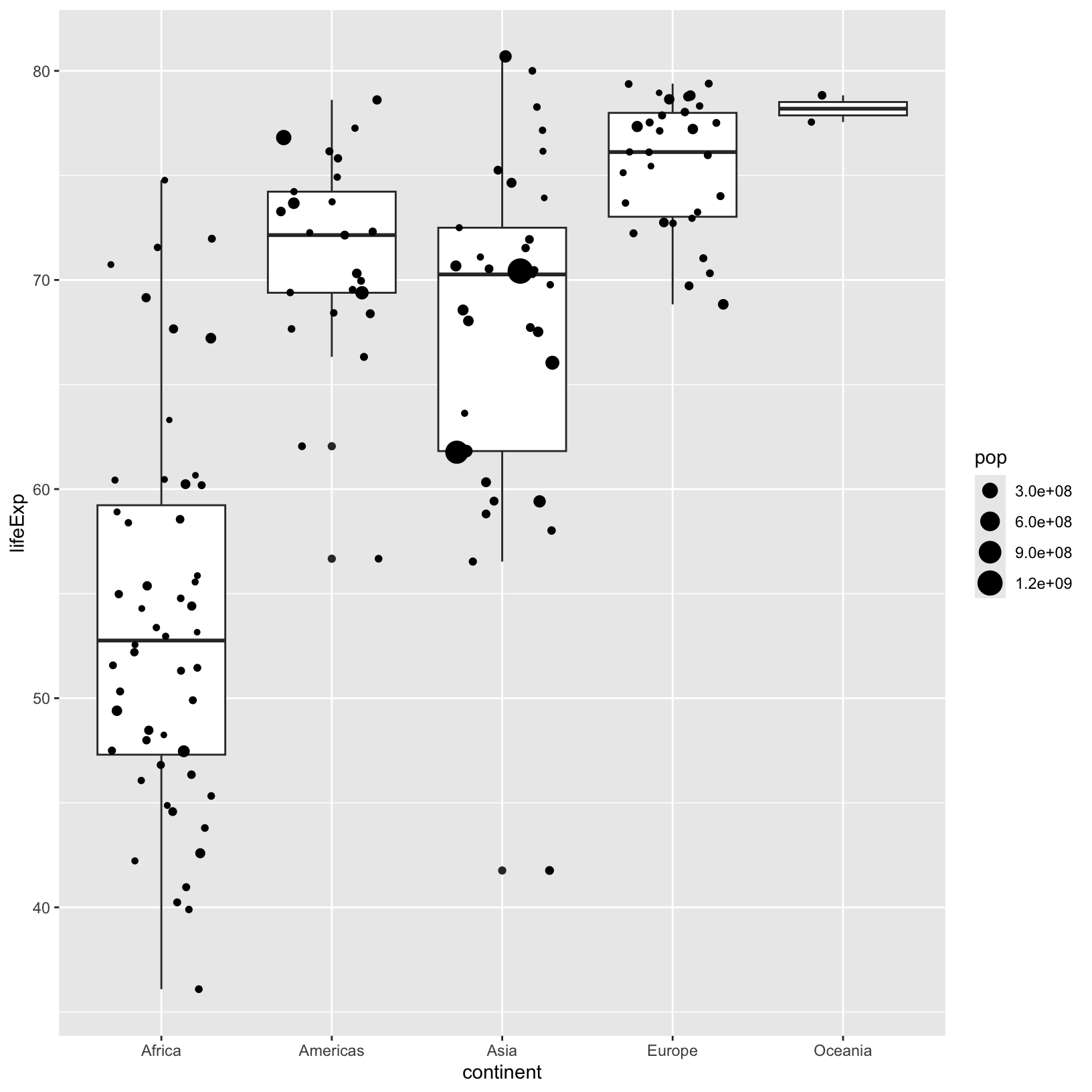 With the continents shown by color, we immediately pick out that African countries tend to have lower life expectancy than other countries. Of course, there are African countries (red points) with life expectancies similar to wealthier countries, suggesting that GDP per capita does not tell the full story about health, as we might have already guessed.