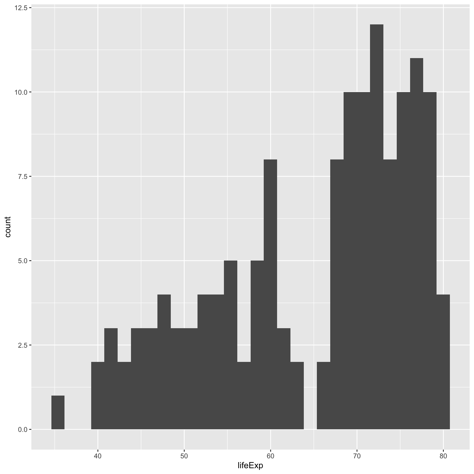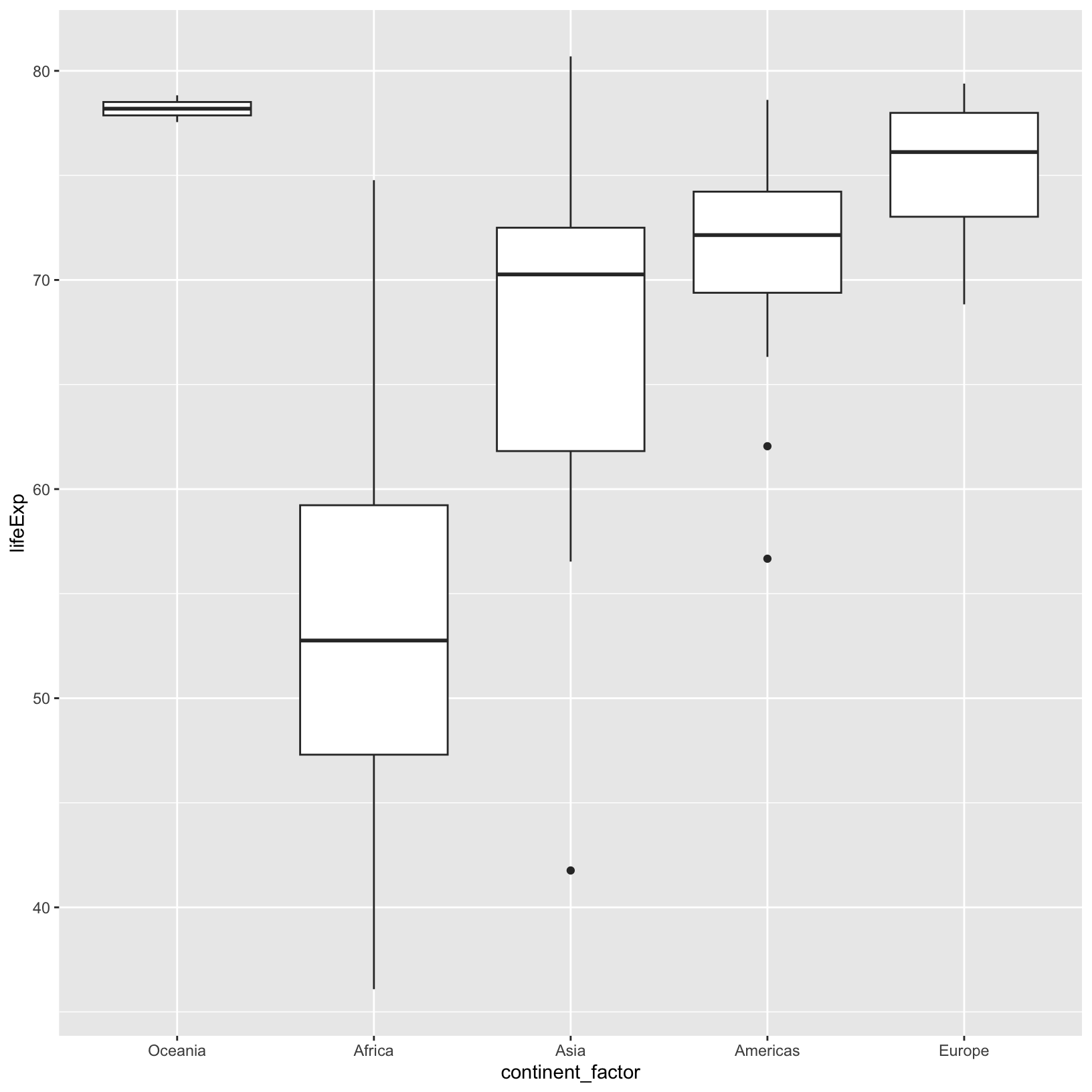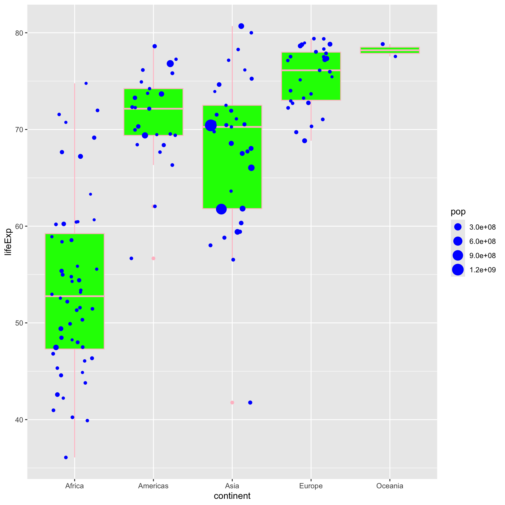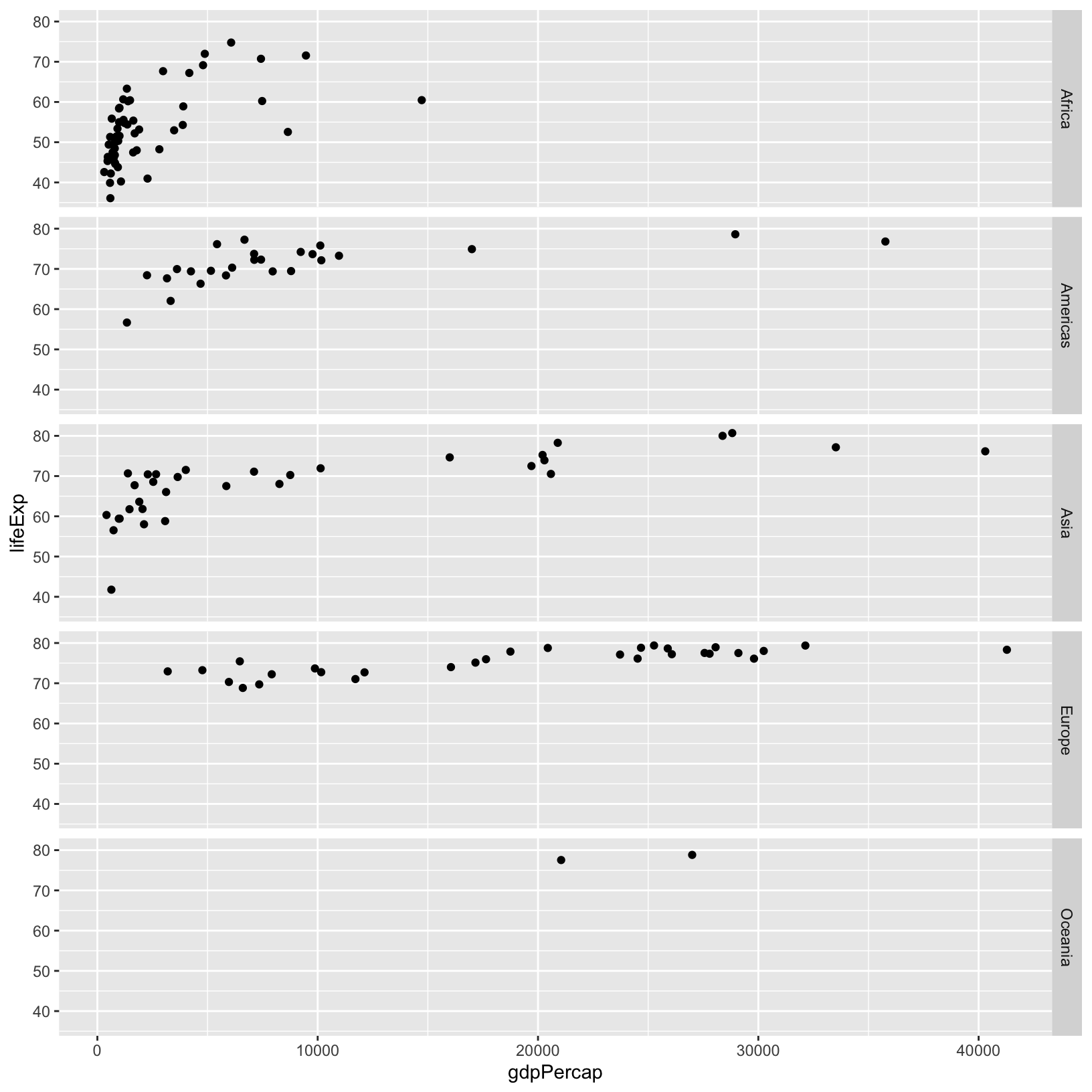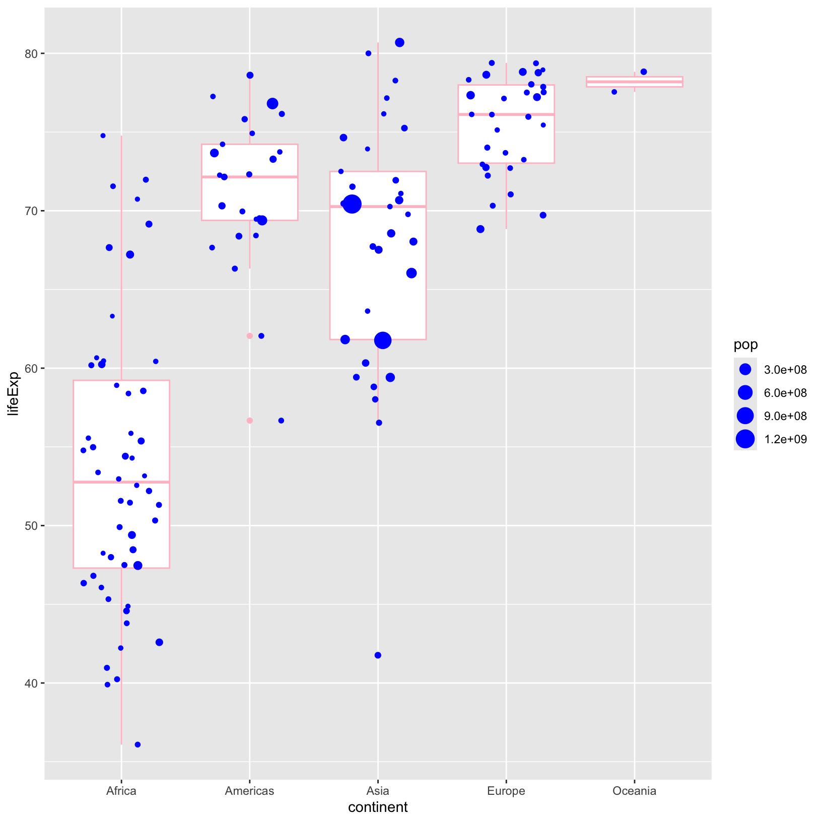 With the continents shown by color, we immediately pick out that African countries tend to have lower life expectancy than other countries. Of course, there are African countries (red points) with life expectancies similar to wealthier countries, suggesting that GDP per capita does not tell the full story about health, as we might have already guessed.