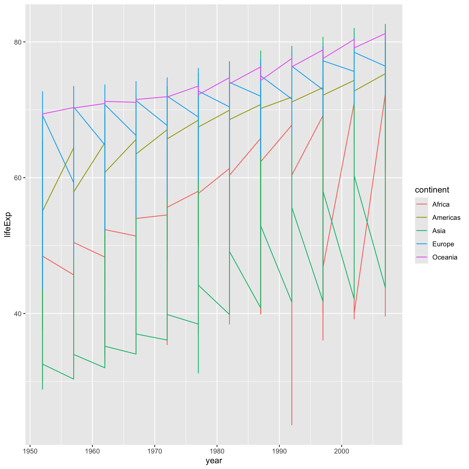 gm |> ggplot(aes(x = year, y = gdpPercap, color = continent, group = country)) +