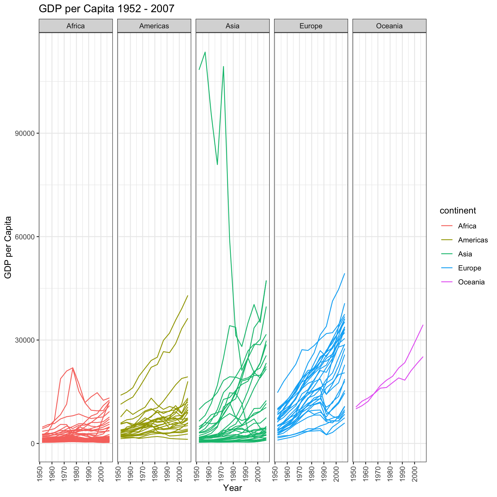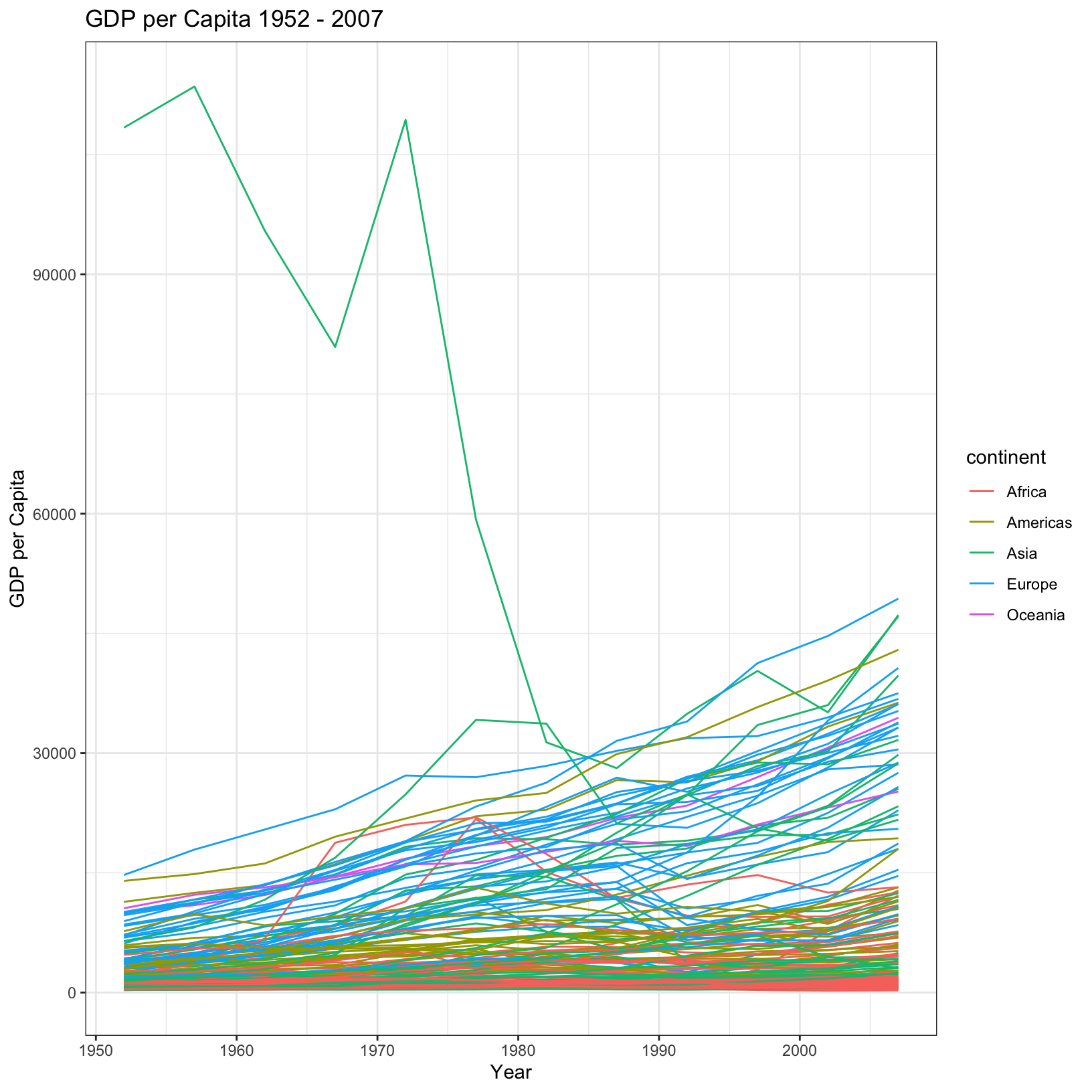 In a previous exercise we created a plot showing the trend of life expectancy across all countries over time, colored by the continent. The following code generates a similar plot but for the GDP per capita.