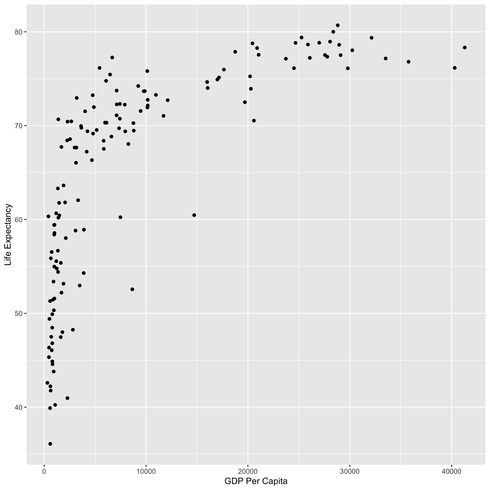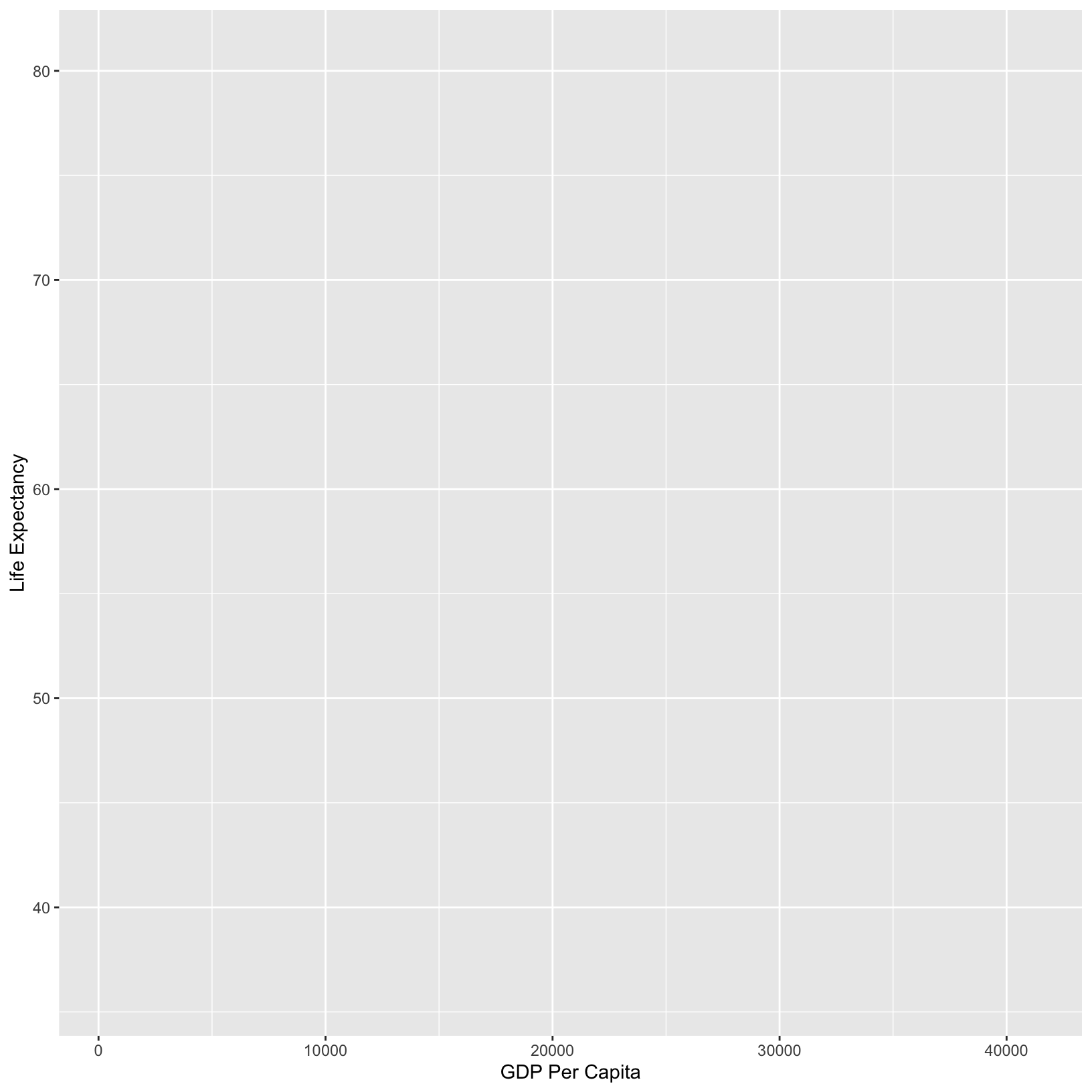 ggplot(data = gm97) + aes(x = gdpPercap) + labs(x = 'GDP Per Capita') + aes(y = lifeExp) + labs(y = 'Life Expectancy')