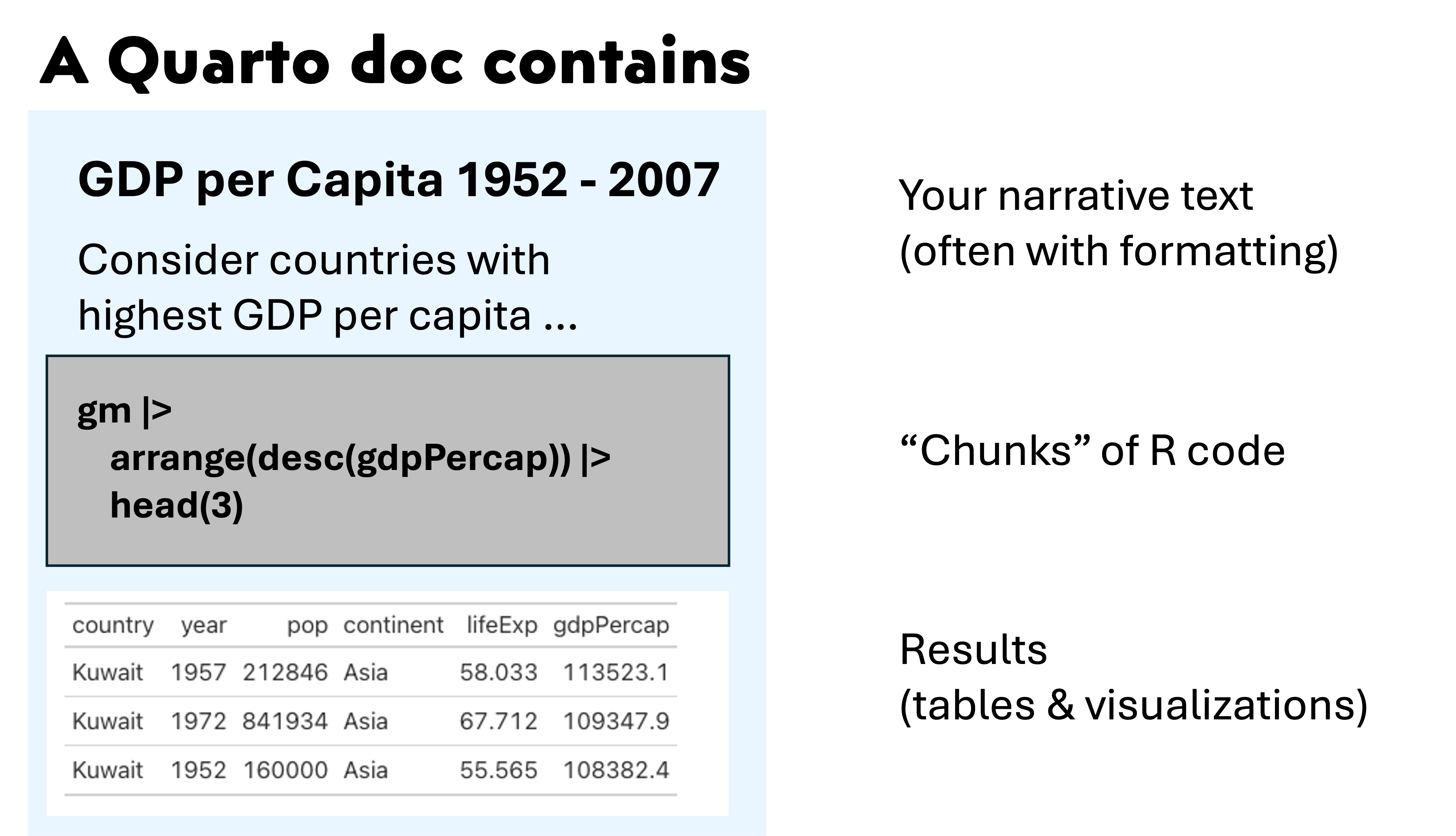 Quarto metadata (at the top) controls how the whole document is rendered