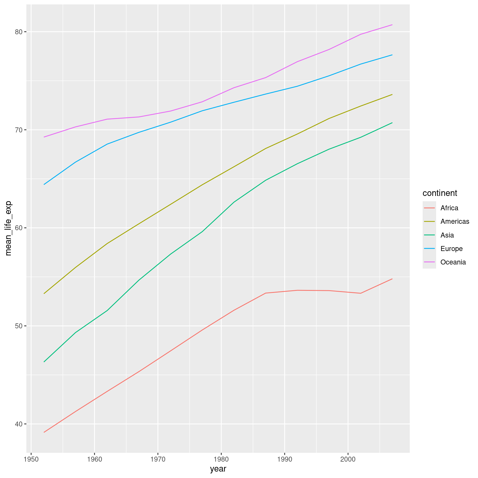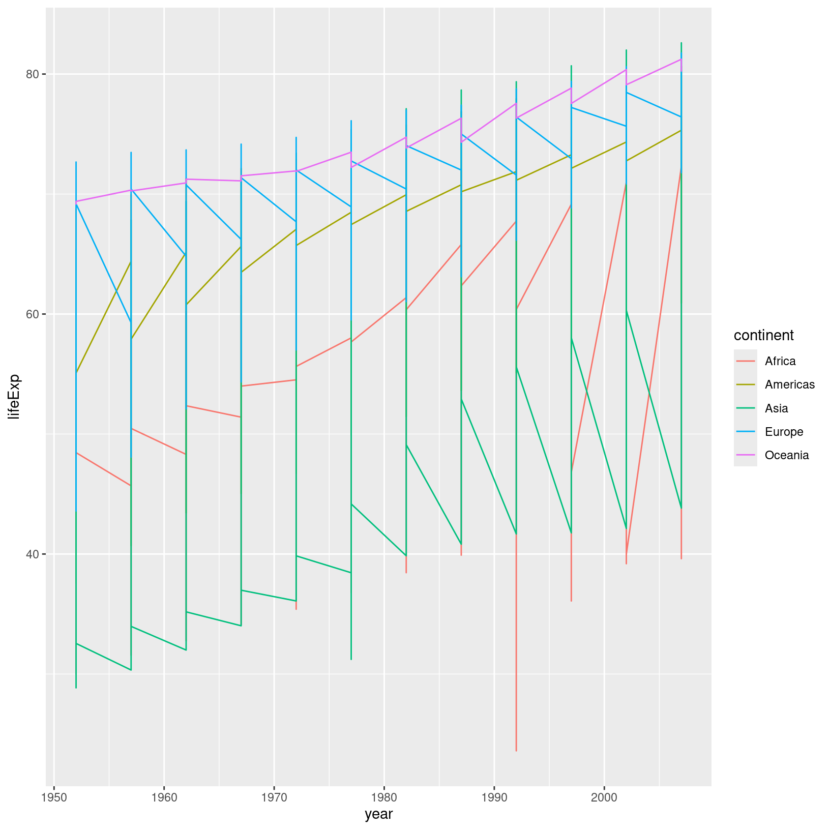 Is this plot clear? Might it be improved by splitting up the continents into their own plots? Below is a plot which pulls apart the trends on the different continents, while still plotting each country individually. Try to write the code that would generate it.