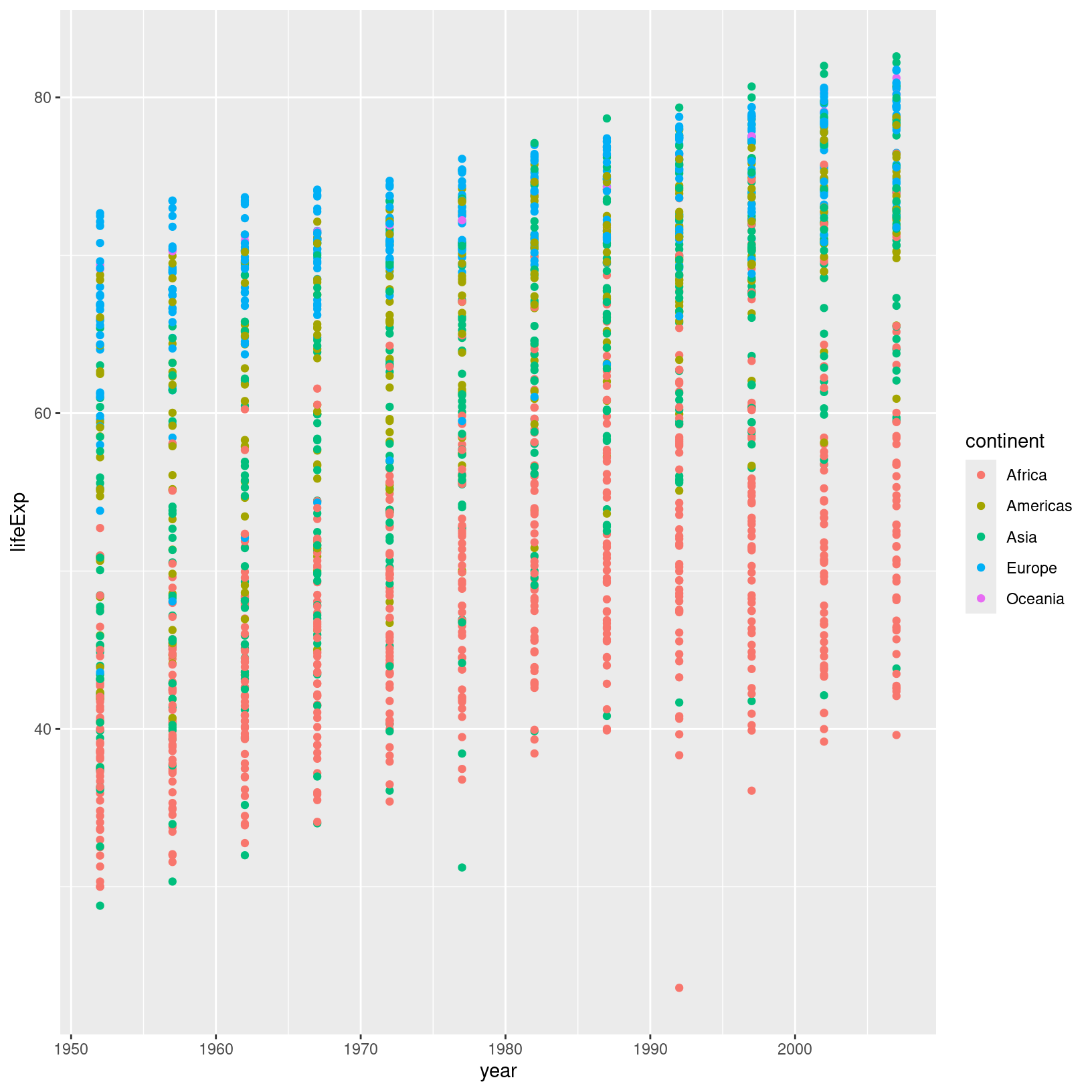 We’ve made excellent progress on our first plot, and without even having to write very much code! There is much more we can do visually to understand what the data might be telling us in addition to the general trend we’ve already observed. For example, we can use different colors for each continent to understand how continent affects this relationship: