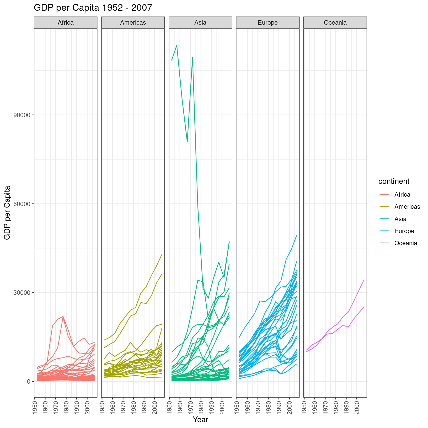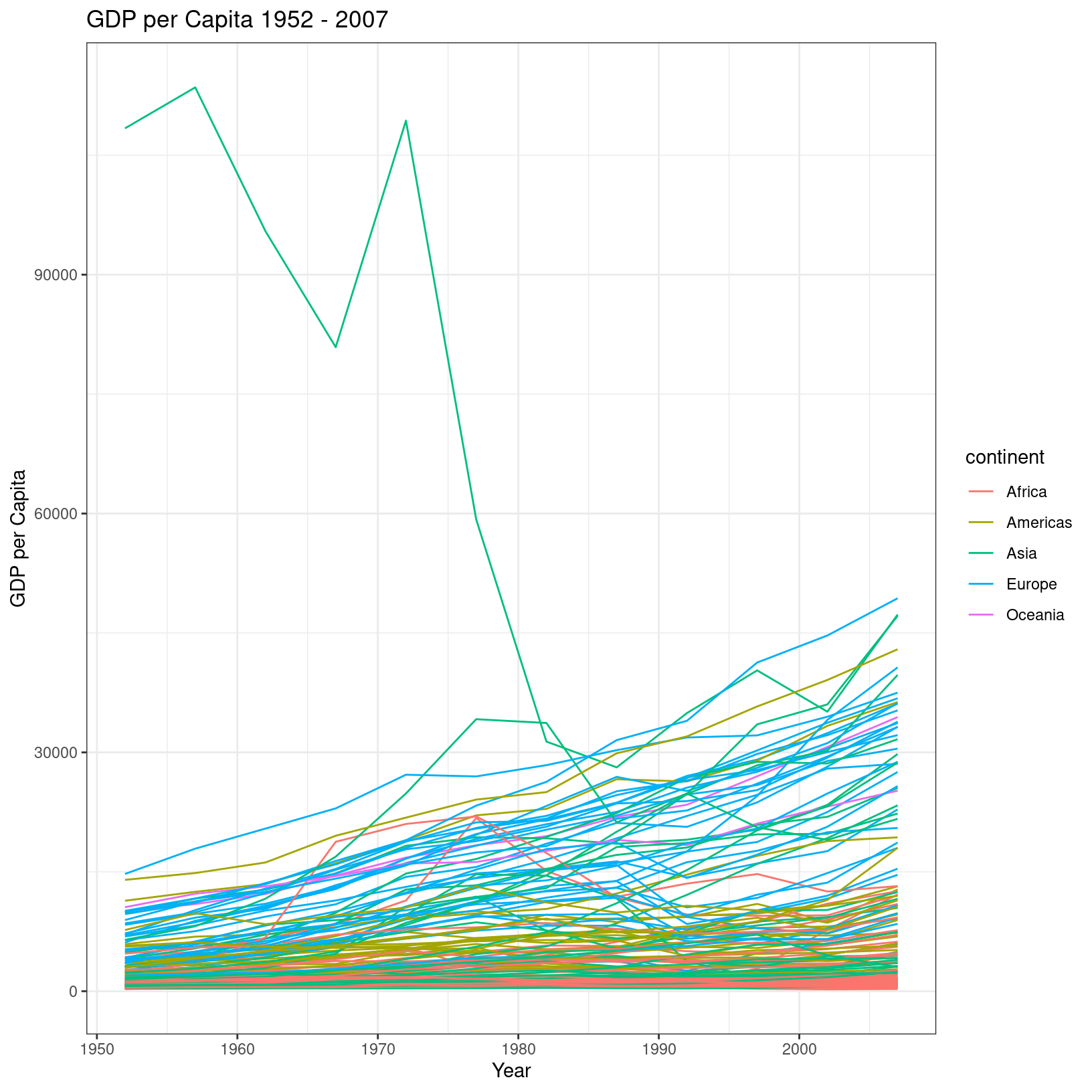 ggplot(data = gm, aes(x = year, y = gdpPercap, color = continent, group = country)) + geom_line() + theme_bw() + labs( title = 'GDP per Capita 1952 - 2007', x = 'Year', y = 'GDP per Capita')