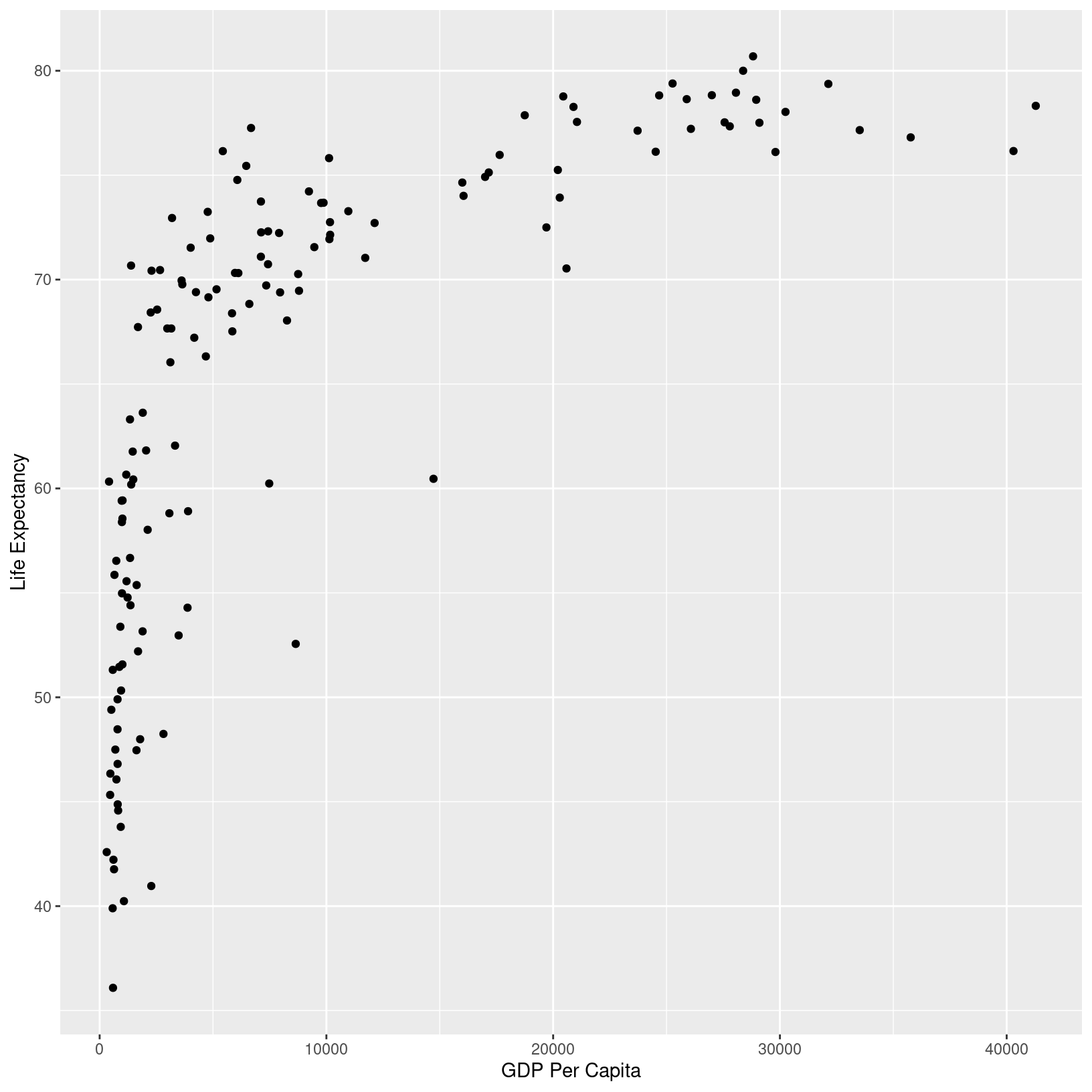 ggplot(data = gm97) + aes(x = gdpPercap) + labs(x = 'GDP Per Capita') + aes(y = lifeExp) + labs(y = 'Life Expectancy')