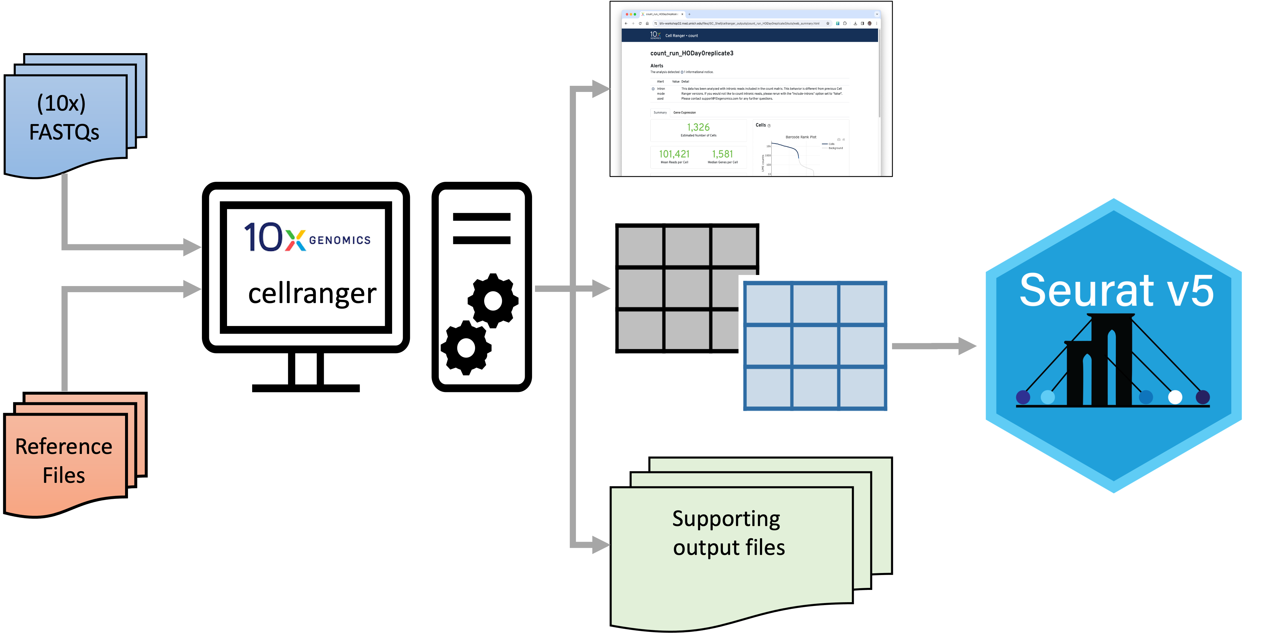 Cell Ranger accepts a set of sample FASTQ files and a set of reference files. It produces a QC web summary (detailed below), a set of matrix files (also detailed below) along with a large collection of supporting files. The matrix files can be used for downstream analysis in Seurat and other tools. |