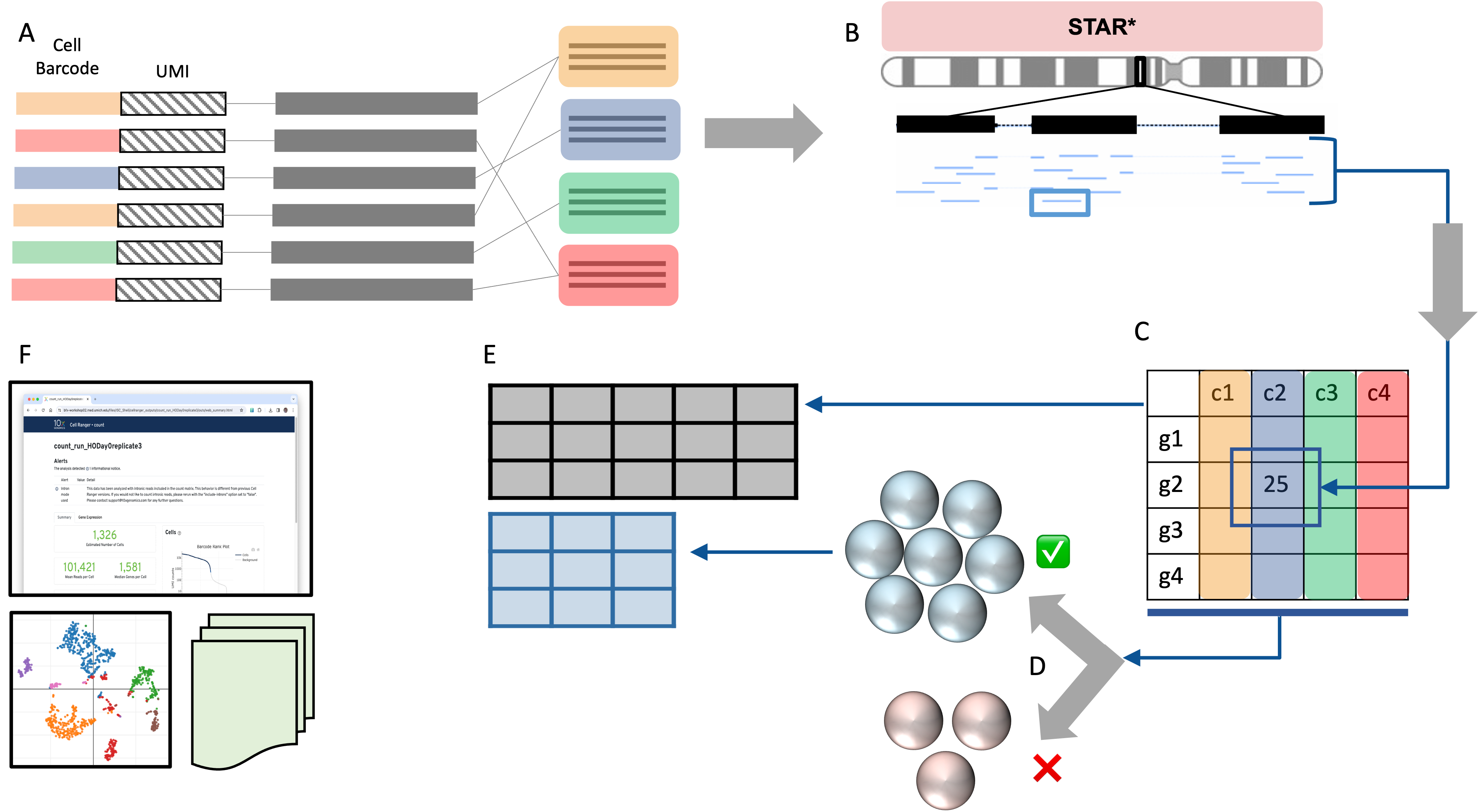 and bin the sequences by their barcodes. B. The transcript sequences are aligned to a genome reference using a modified version of the STAR aligner. C. For each transcript that falls in a gene, count the pile-up of sequences aligned to each gene; deduplicate the reads based on UMI. Use these deduplicated counts to build a feature barcode matrix. D. Apply a cell-calling algorithm to distinguish putative cells from background [3,4] E. Subset the raw matrix to only putative cells to create the filtered matrix. F. Use information from all previous steps to build a web summary QC report as well as basic gene expression clustering visualizations and other supporting files. |