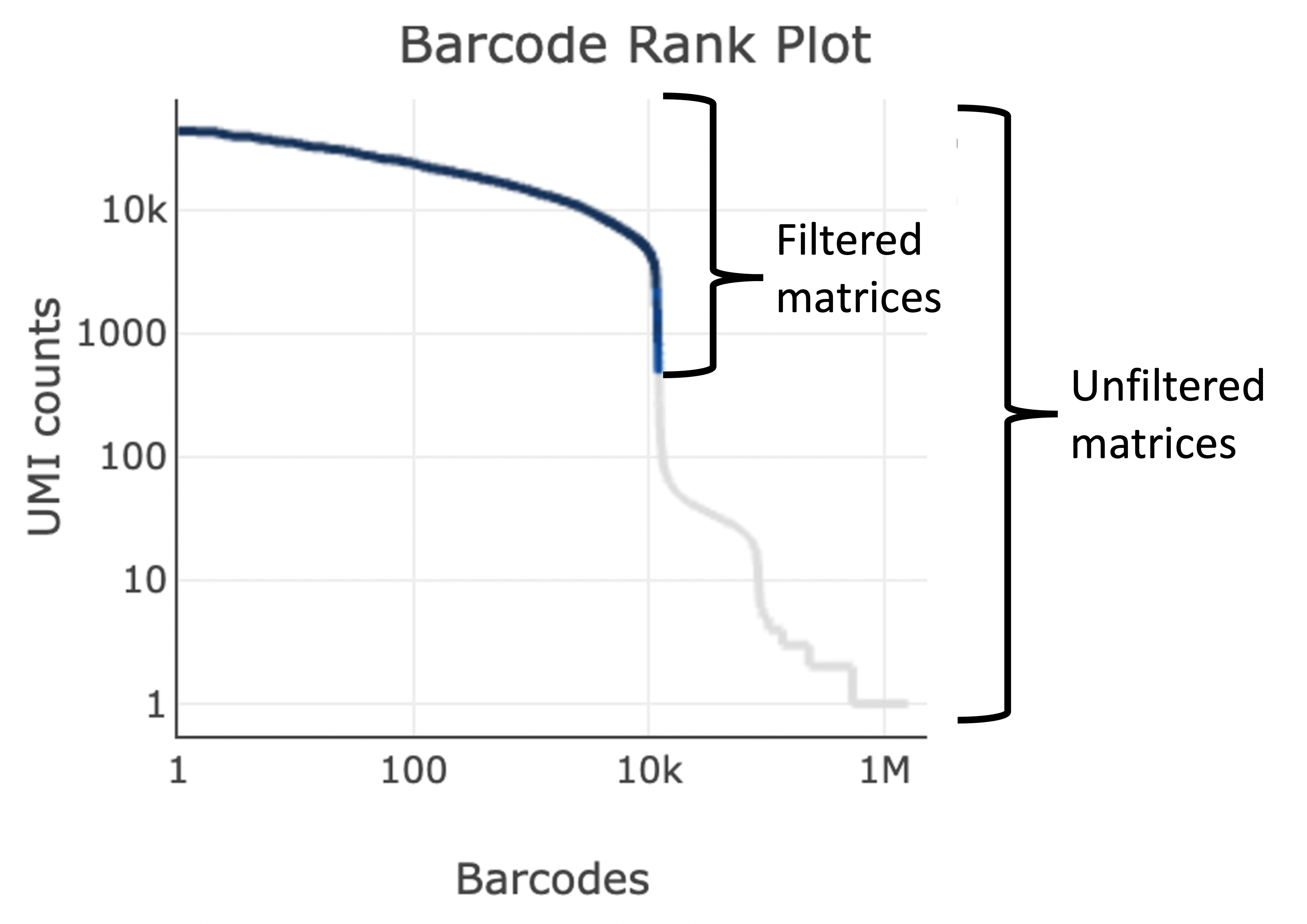 Basically, all 10x Barcodes detected during sequencing (~100k) are plotted in decreasing order of the number of UMIs associated with that particular barcode. The number of UMIs detected in each GEM is then used by Cell Ranger to identify barcodes/GEMs that are likely to contain an intact cell based on the expected cell number and UMI counts. Then distinguish low RNA content cells from empty droplets, since GEMs containing cells are expected to have a greater number of transcripts (and thus UMIs) associated with them than non-cell containing GEMs.