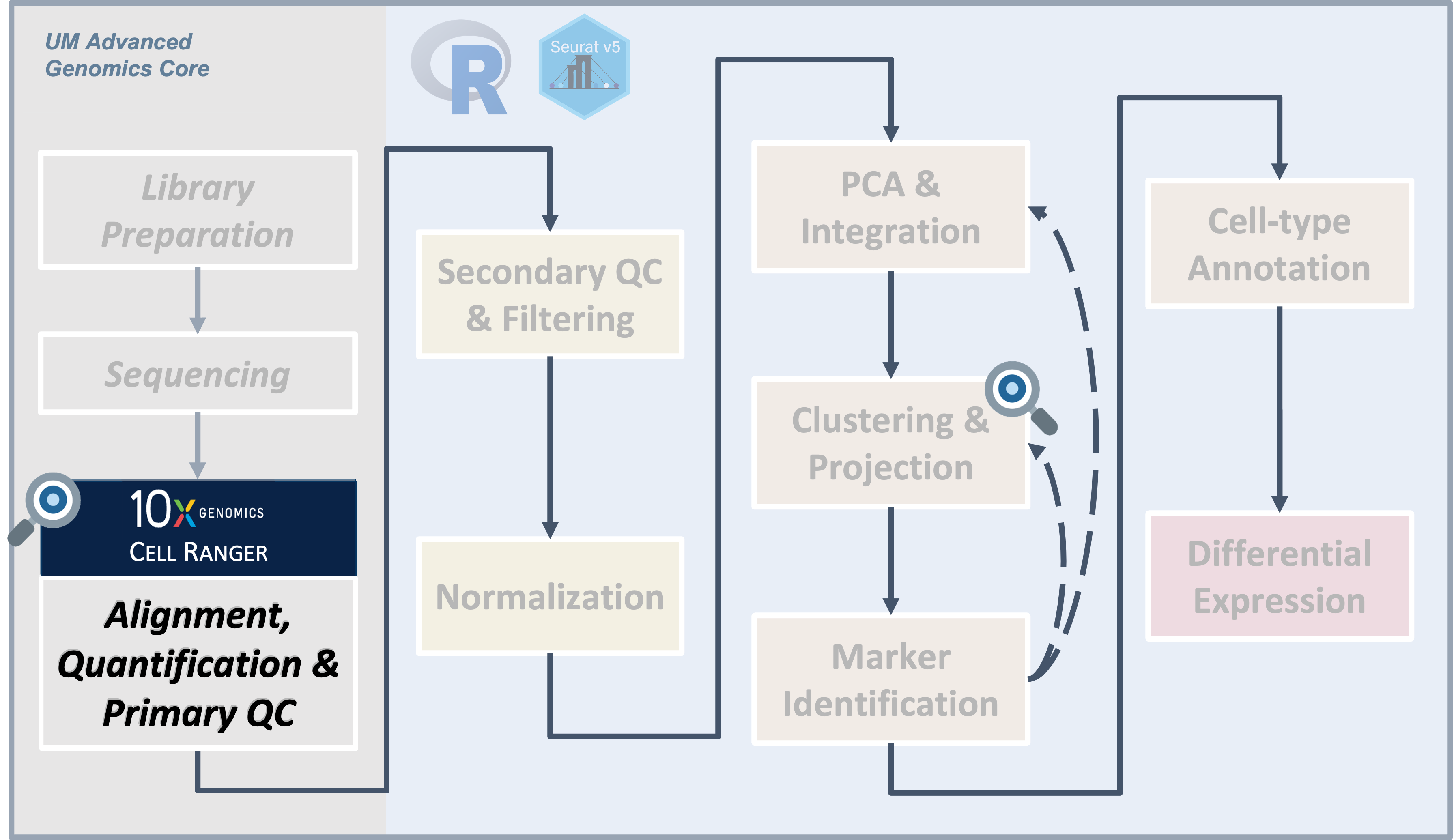 sequencing.The initial data processing steps in scRNA-Seq transform sample FASTQ files to gene expression counts. Some of these steps are similar to bulk RNA-Seq and some are distinct. 10x Genomics provides a pipeline tool, Cell Ranger, to expedite these initial transformations [1].