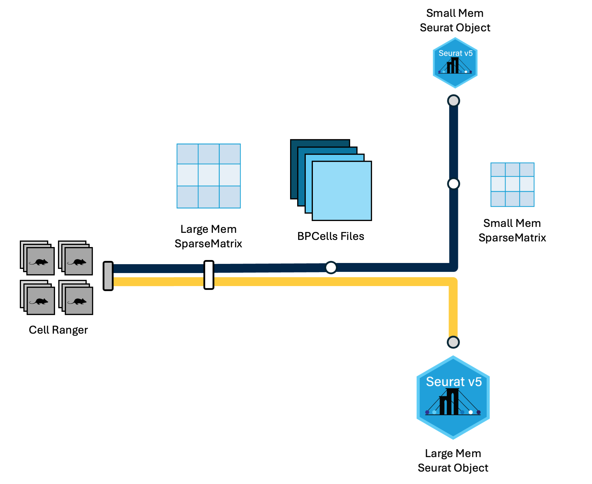 Cell Ranger outputs can be read into R via the triple of files directly, or via a memory saving route with the BPCells package. We provide code for both routes in this section. |