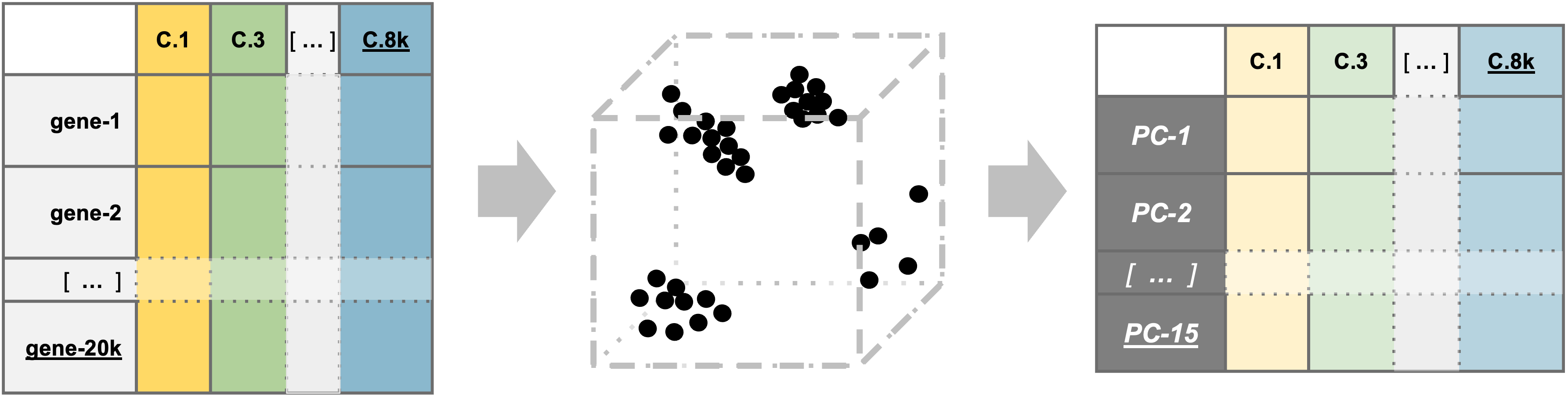 Starting with filtered, normalized data [gene x cell] for all samples - principal component analysis (PCA) can be used to reduce the dimensionality while still representing the overall gene expression patterns for each cell |