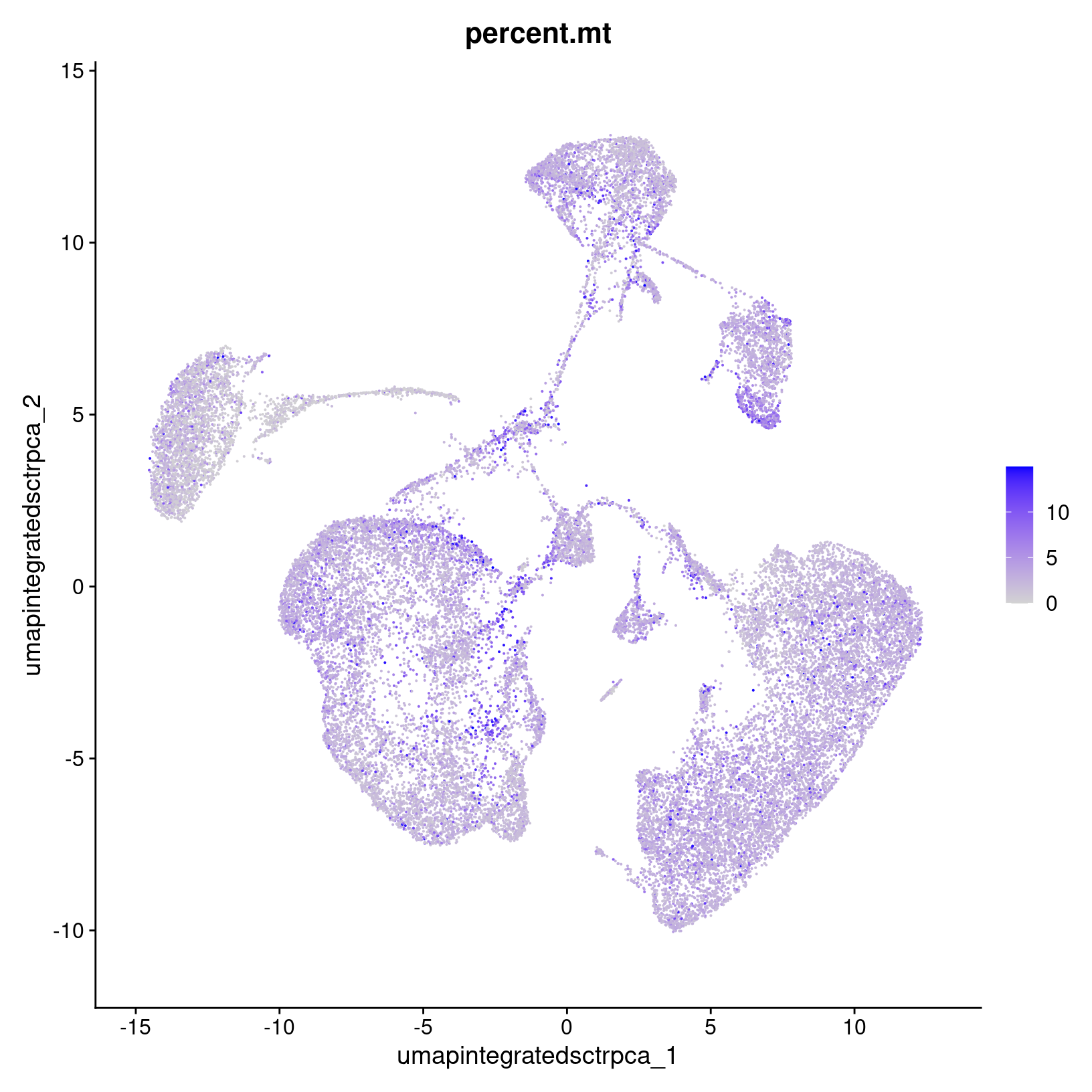 We see that a higher percentages seem to be somewhat concentrated in a few places, but if cell death might be of interest for the research question, we’d want to consider investigating this pattern further by splitting up the plots by day and/or waiting until after running initial differential expression analysis to determine if these cell populations are interesting biology or not.