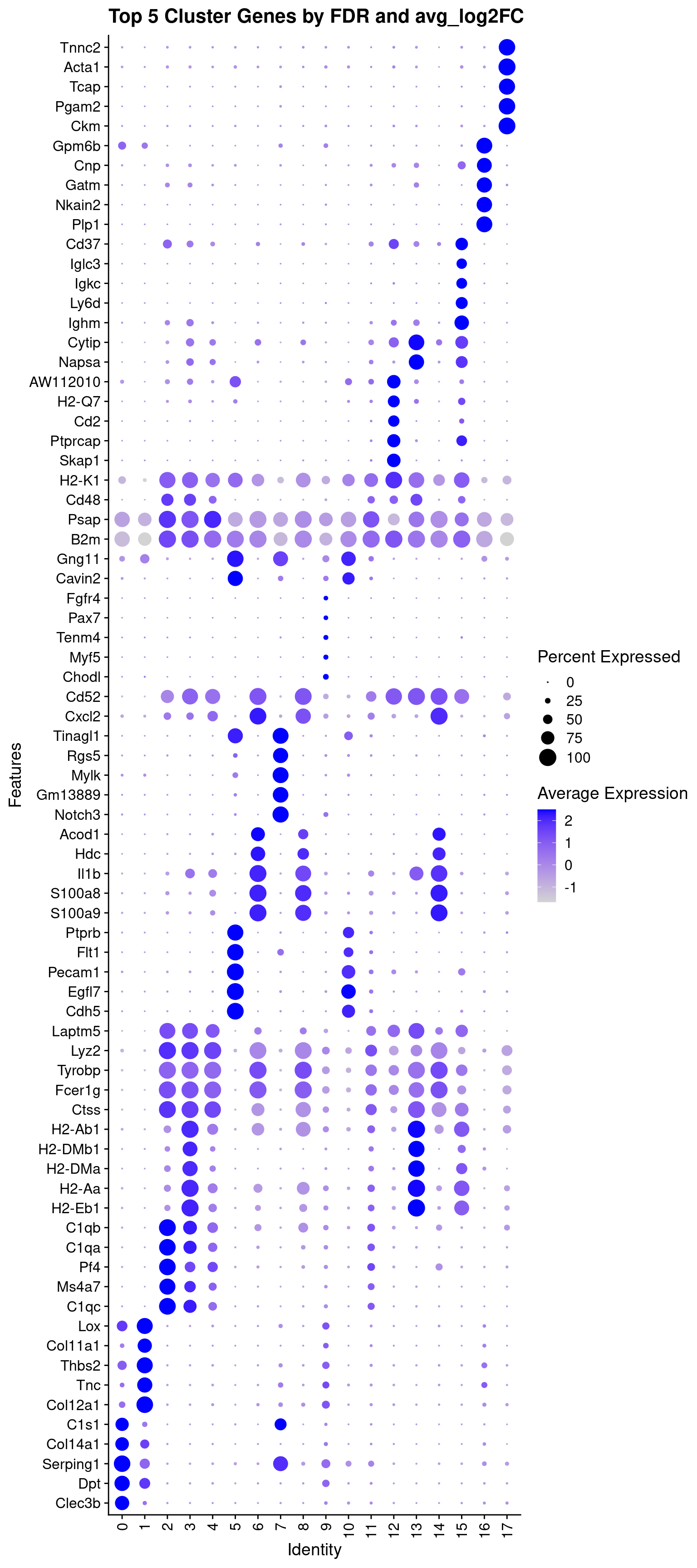 labs(title = 'Top 5 Cluster Genes by FDR and avg_log2FC') +