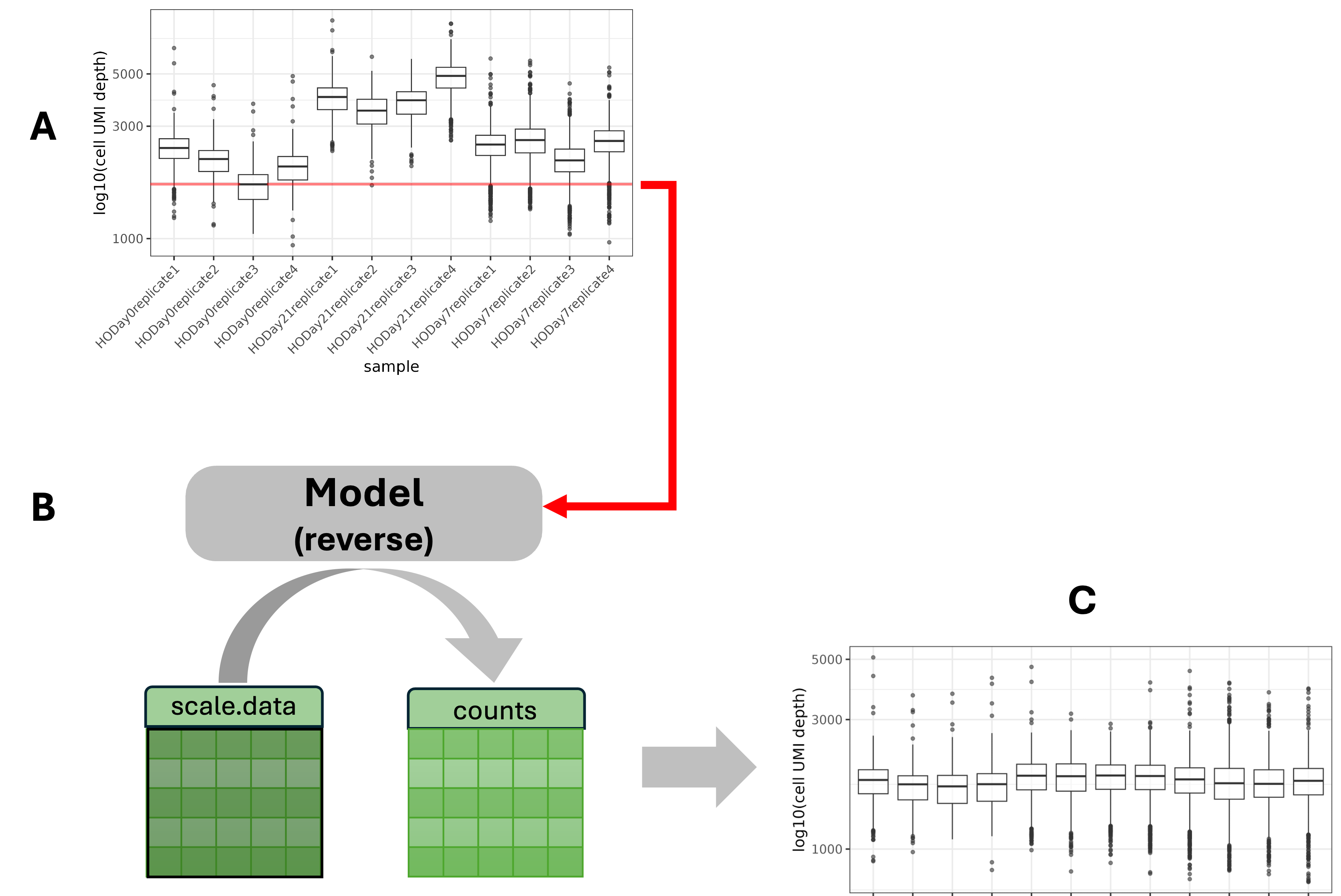 A. Plot A shows the depth distributions of SCT counts across samples. Since we have many samples and the counts were recalculated on a sample-by-sample basis, any comparison across samples would be confounded by the inconsistent sample depths.