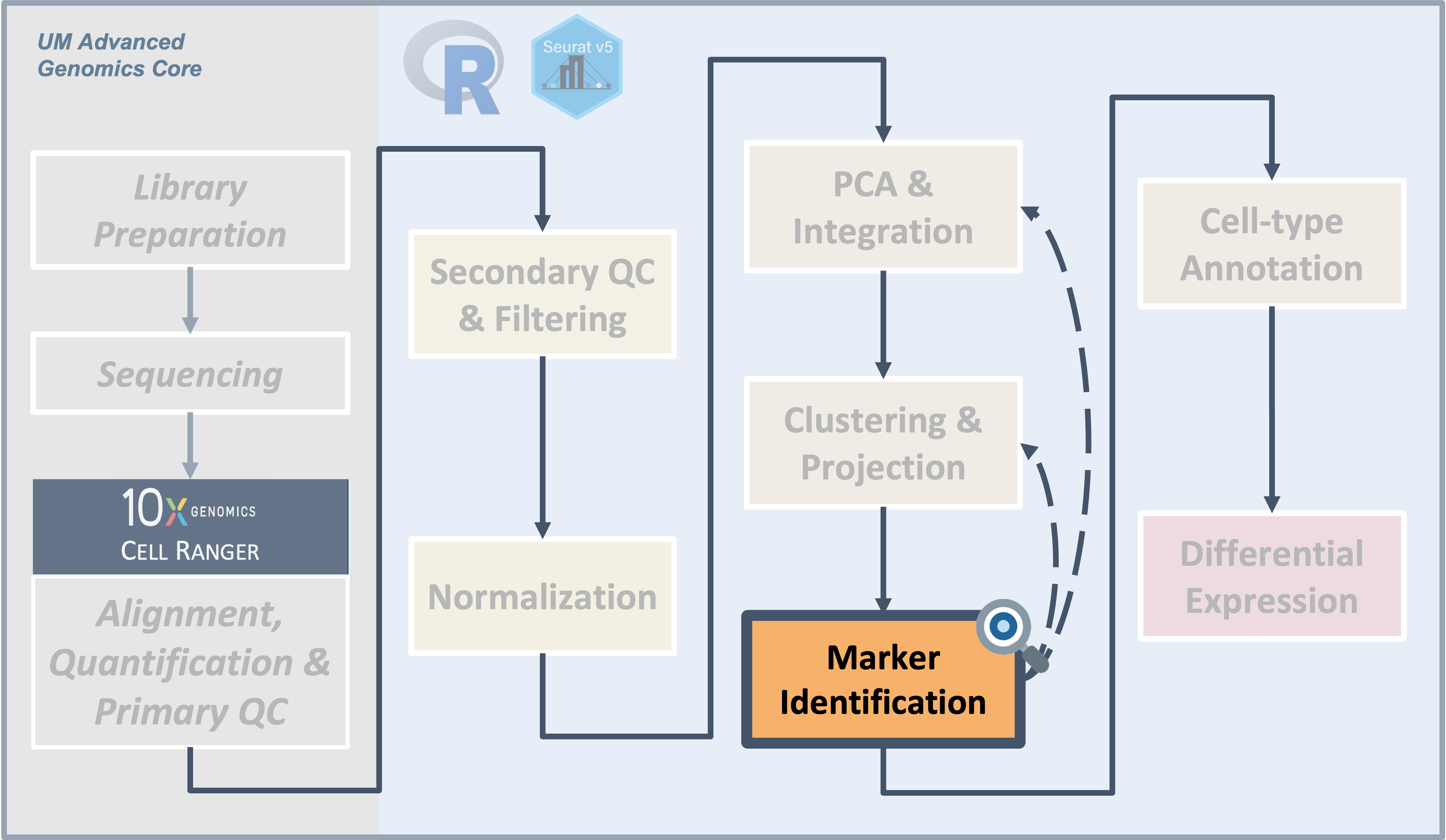 After generating clusters, we need to perform differential expression analysis to identify the genes that distinguish those clusters (source). This should allow us to get visibility on some key questions for our clusters, as highlighted by the HBC materials, namely: