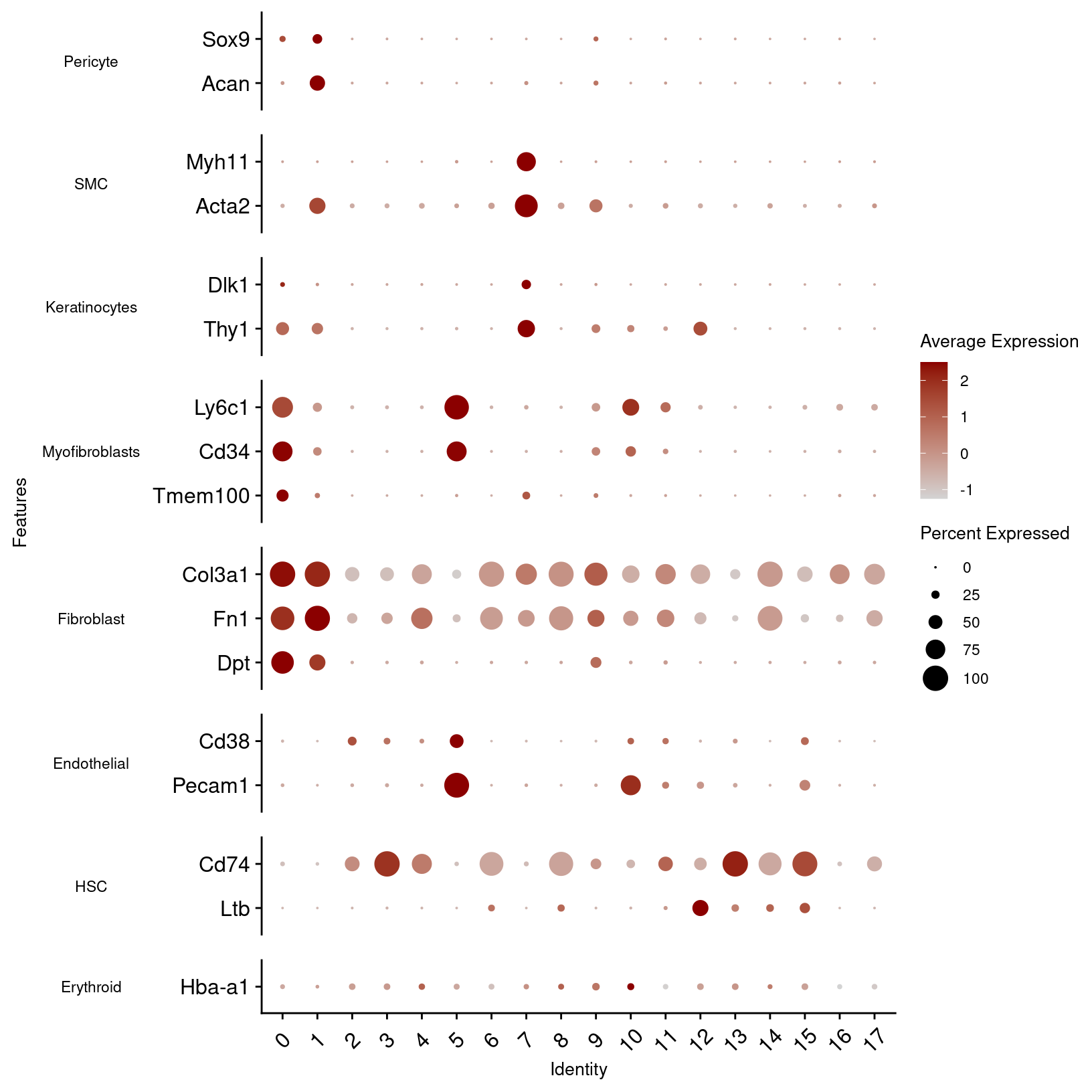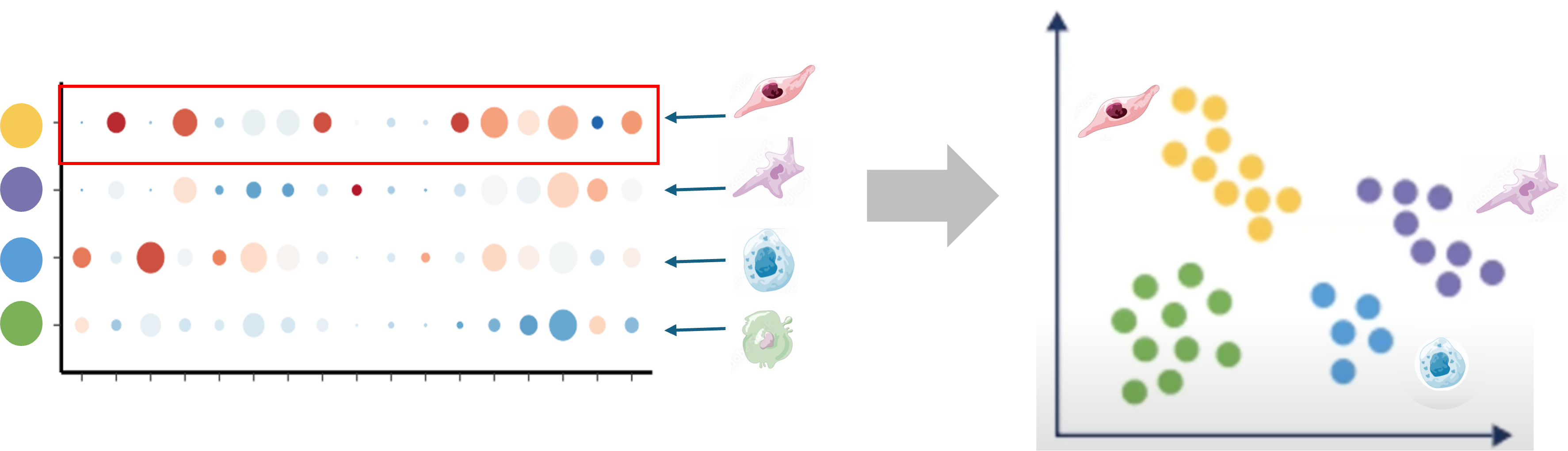 Starting with clustered data, we can summarize and compare gene expression for known gene markers within each cluster, irrespective of sample or condition, to help label clusters with the appropriate cell-type or subtype. |