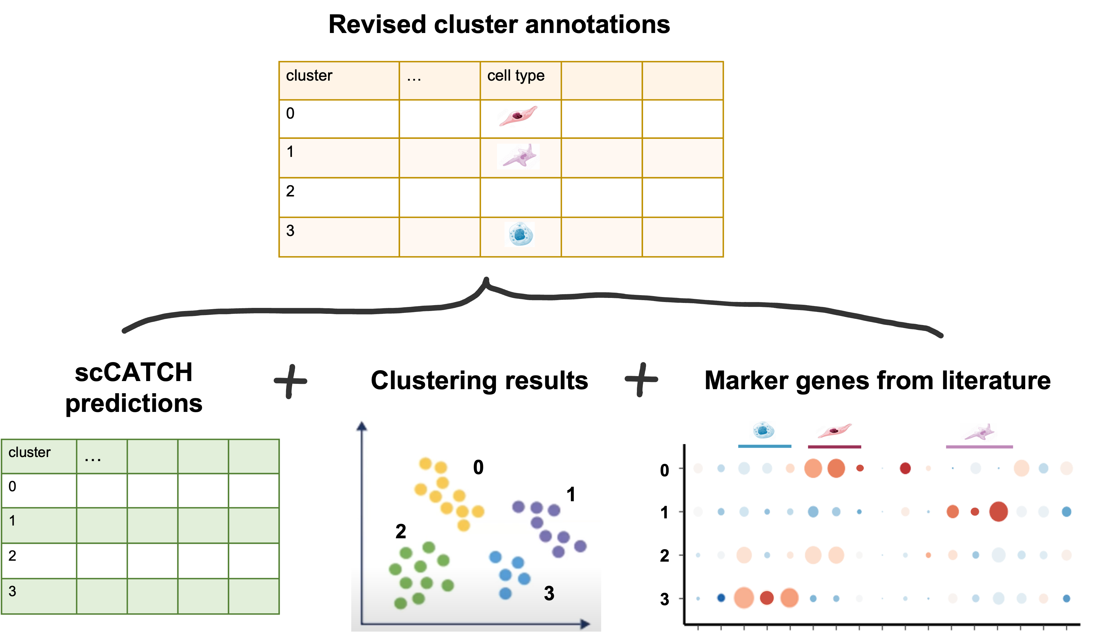 A tool we often use for both mouse and human data cell-type predictions is called scCATCH which, per the author’s description in Shao et al (2020), annotates cell-types using a “tissue-specific cellular taxonomy reference database (CellMatch) and [an] evidence-based scoring (ES) protocol”. The CellMatch reference is compiled from CellMarker (Zhang et al., 2019b), MCA (Han et al., 2018), CancerSEA (Yuan et al., 2019), and the CD Marker Handbook and PMIDs for relevant literature are reported in the prediction results.