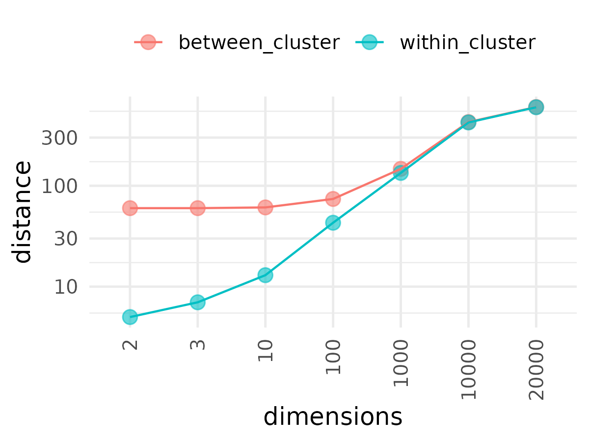 If we take these two clusters and start adding dimensions, the within cluster distances and between cluster distances begin apart (i.e. the cluster is well separated in lower dimensions) but quickly merge together in higher dimensions. Most points become equidistant in higher dimensions; as distance becomes uniform, it becomes difficult to create distinct clusters.
