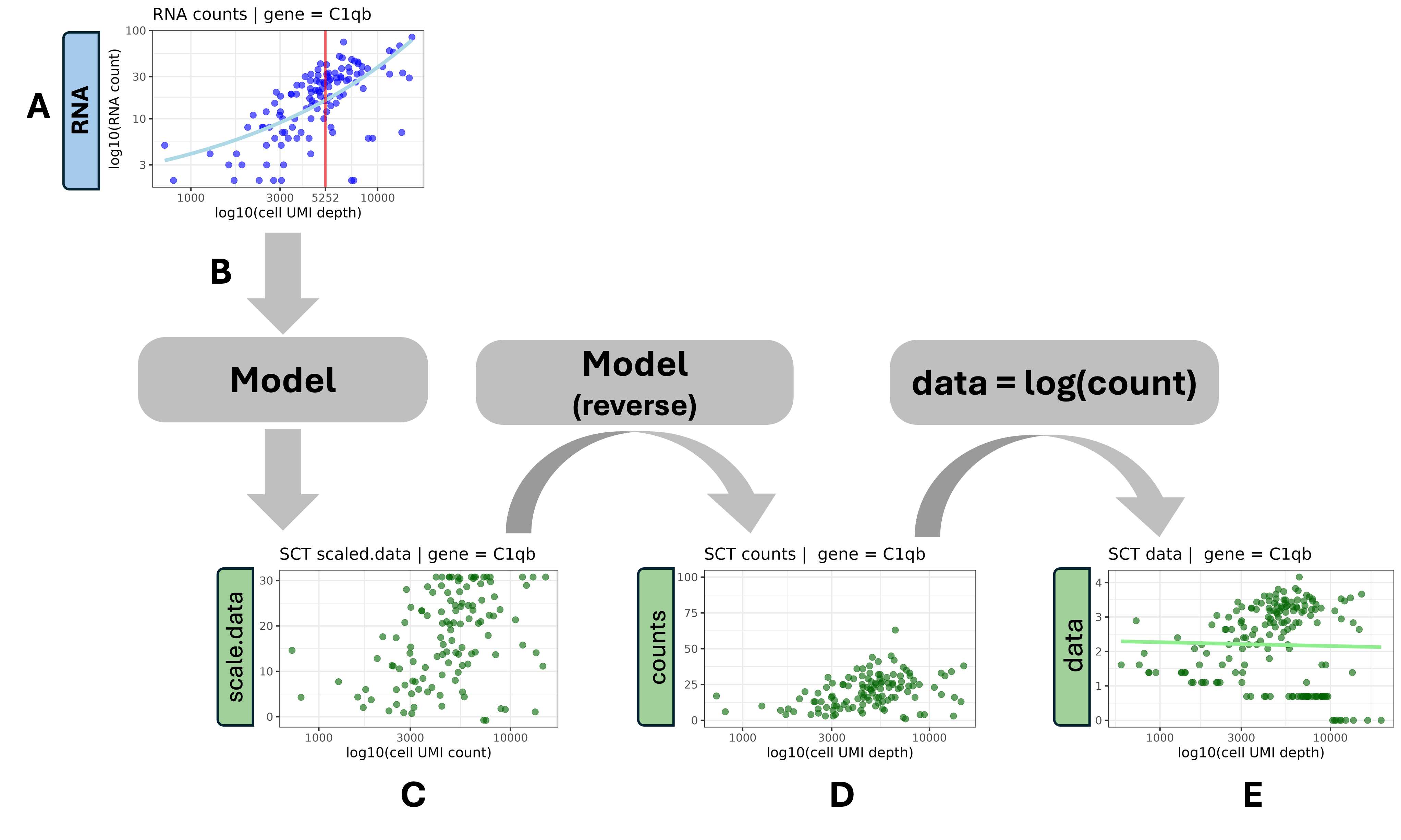 Again, the plots above are focused on one gene and one sample (representing a subset of measured cells), so these results would represent the “first part” of a single row of these new SCT matrices. After fitting a model on all genes and all samples we get three full SCT matrices shown above.