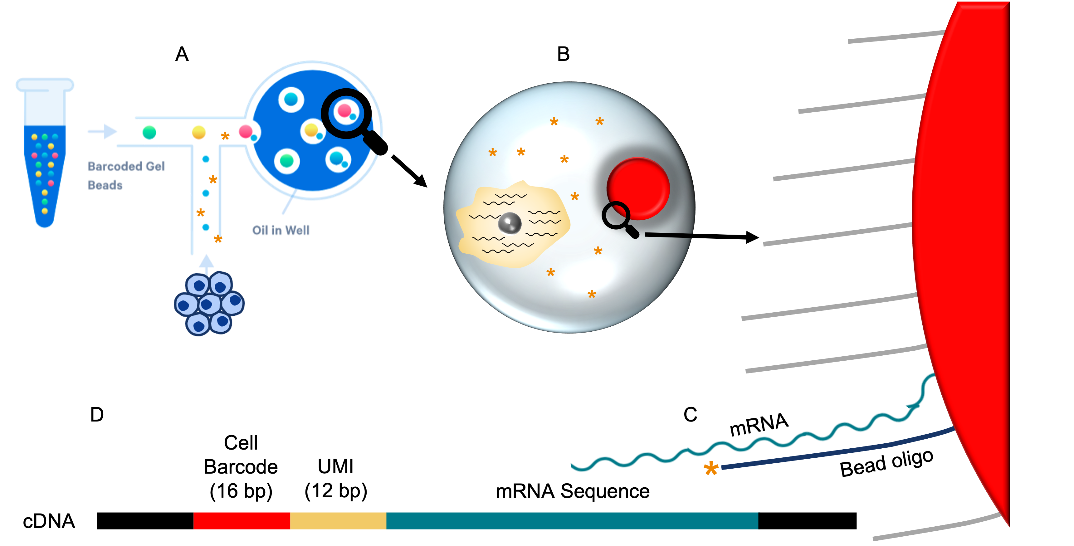 - Each droplet converts mRNAs into cDNAs that contain the oligo