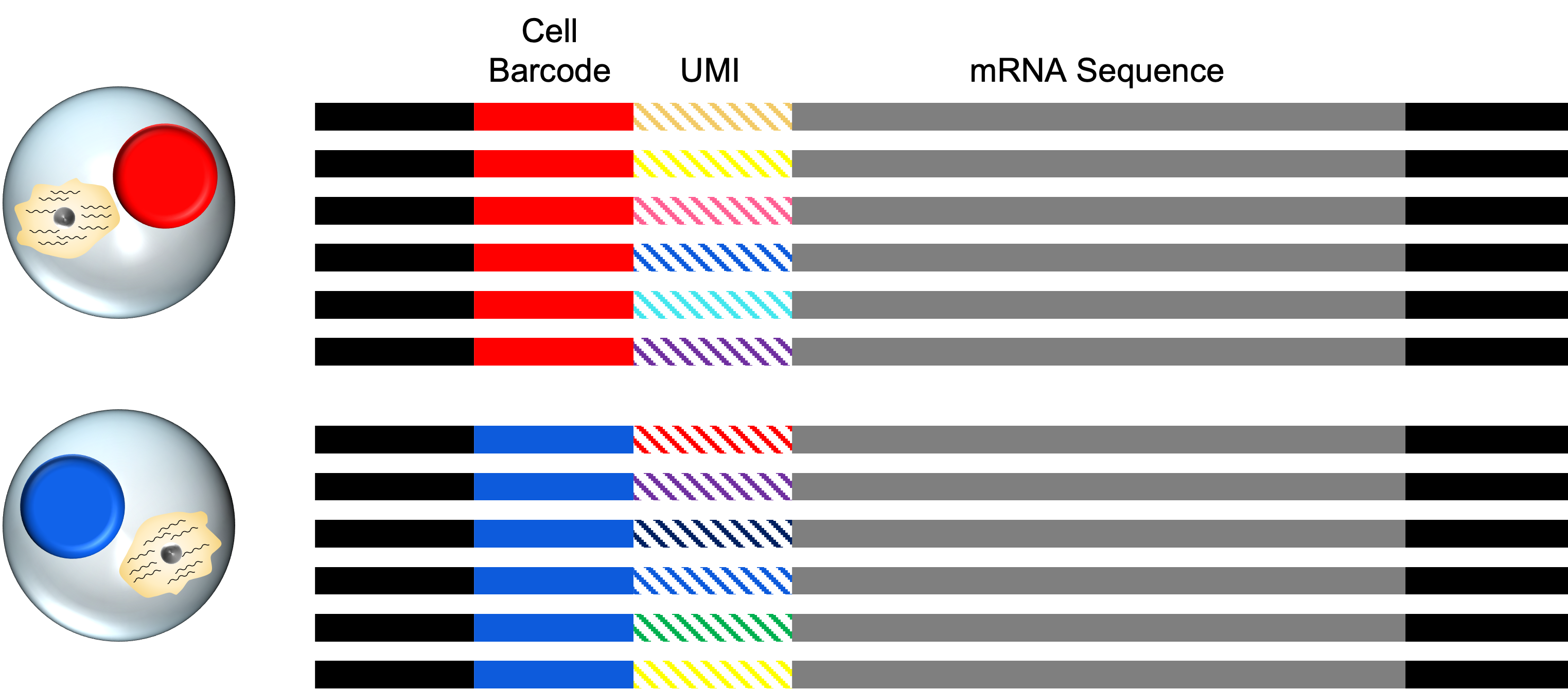 - Each mRNA sequence will get a distinct UMI, so one UMI = one