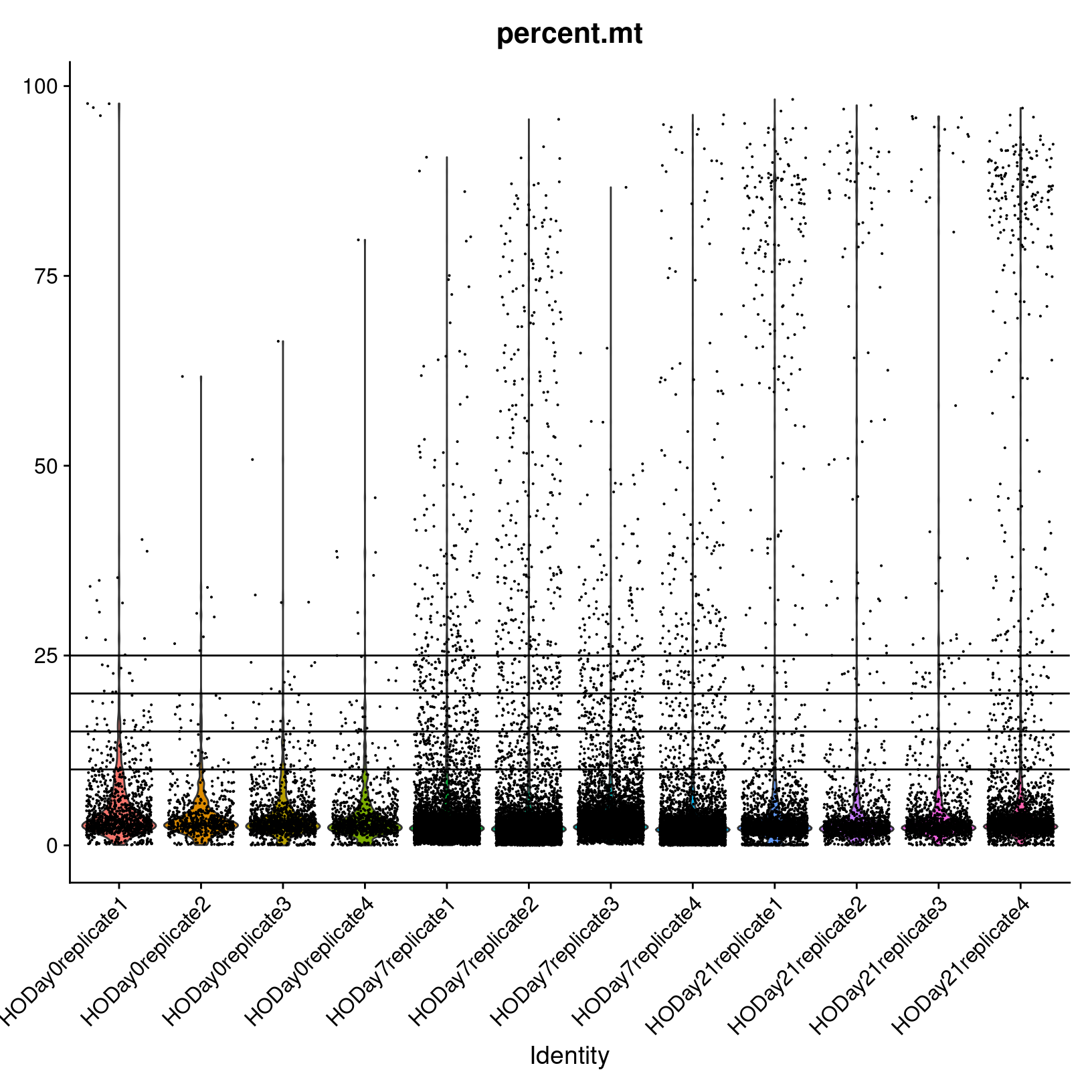 We filtered out cells with less than 500 genes per cell and with more than 25% mitochondrial read content.