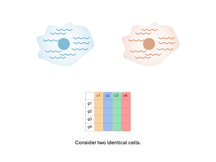 Consider two cells that are identical in terms of their type, expression, etc. Imagine that we put them through the microfluidic device and then sequenced the RNA content.