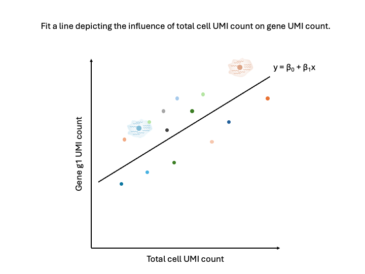 If we were to plot the total cell UMI count against a particular gene UMI count, in an ideal world, the points should be directly on top of each other because the cells had identical expression and everything done to measure that expression went perfectly.
