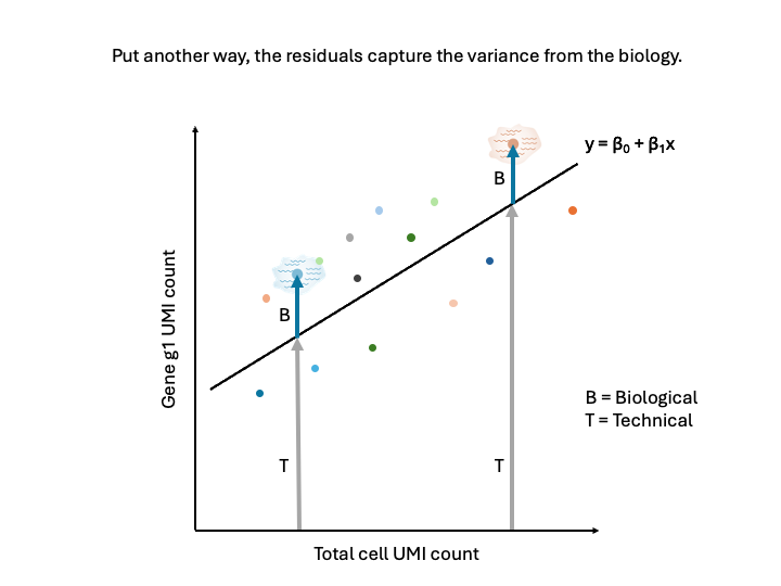 The residuals, or the distance from the point to the line, represents the expression of the gene less the total cell UMI count influence.