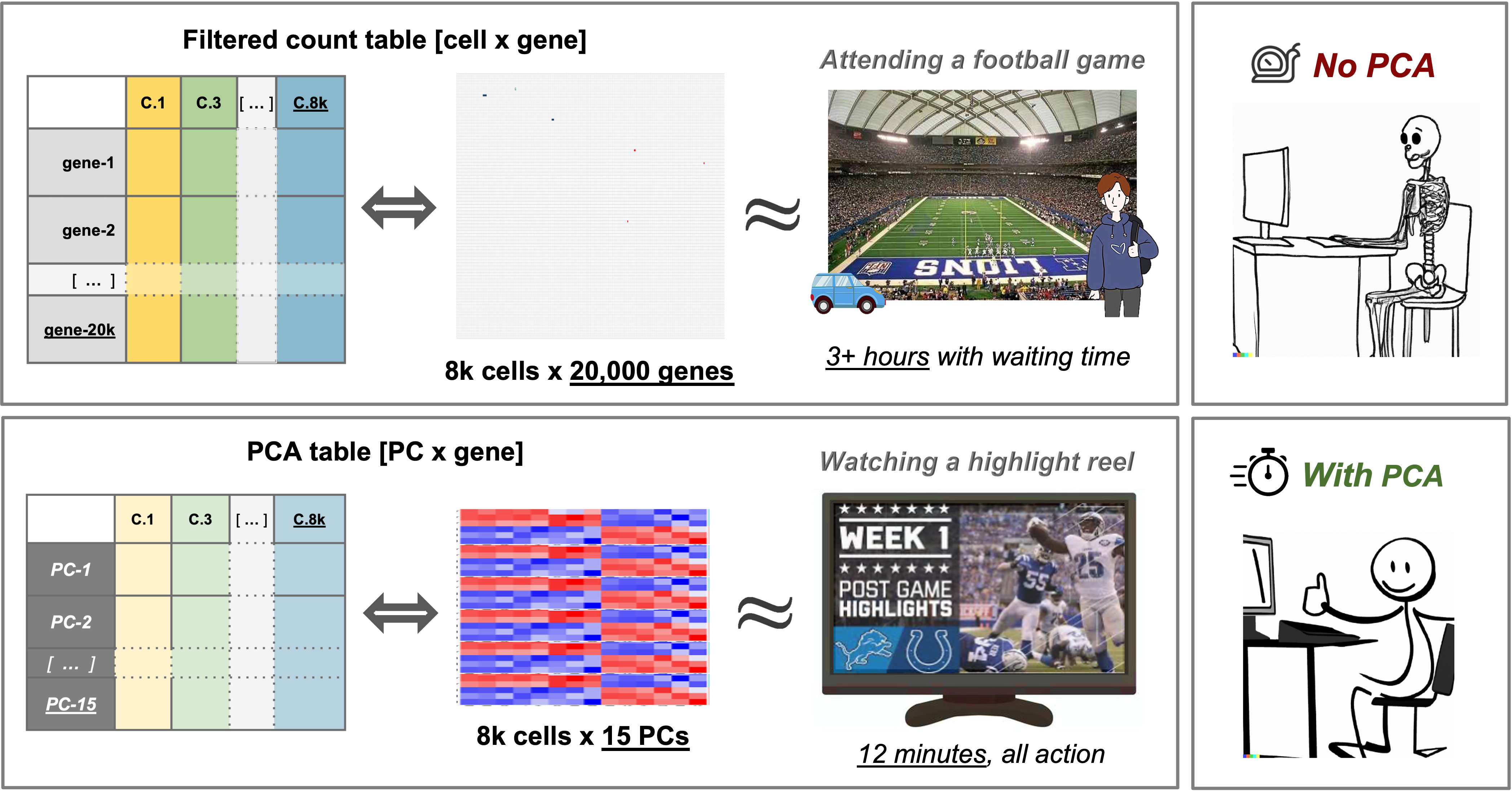 Similarly to a highlight reel, running PCA allows us to select PCs that represent correlated gene expression to reduce the size and complexity of the data while still capturing the overall expression patterns and also reducing computation time.