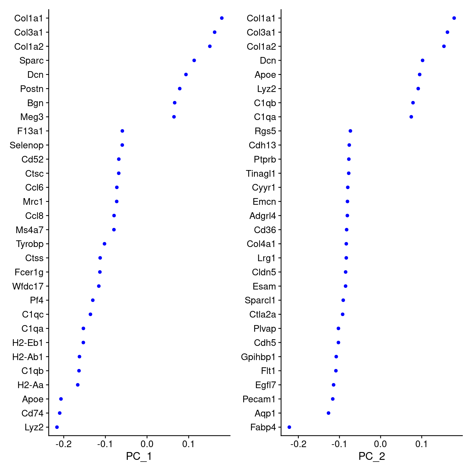We won’t illustrate the process of generating all possible PCs, but running PCA on our data will result in a score for each cell for each PC and each gene will have a weight or loading for a given PC. By definition, the PCs capture the greatest factors of heterogeneity in decreasing order in the data set (source).