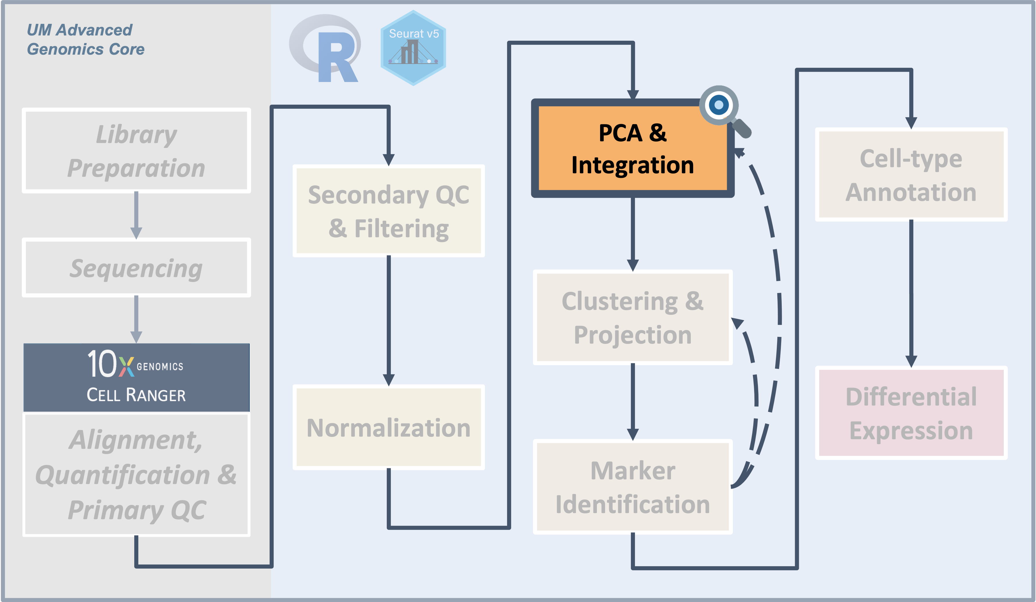 The details of how integration works depends on the method, but for the RPCA approach that we’ll be using here - the process is similar to the canonical correlation analysis (CCA) approach illustration above (source). However, RPCA is more efficient (faster) to run and better preserves distinct cell identities between samples (source). As described in the corresponding Seurat tutorial, each dataset is projected into the others’ PCA space and constrain the anchors