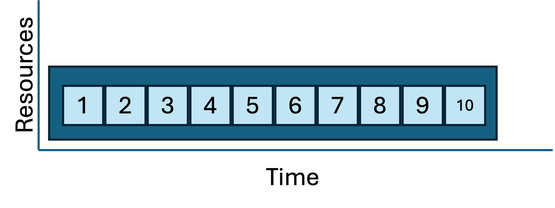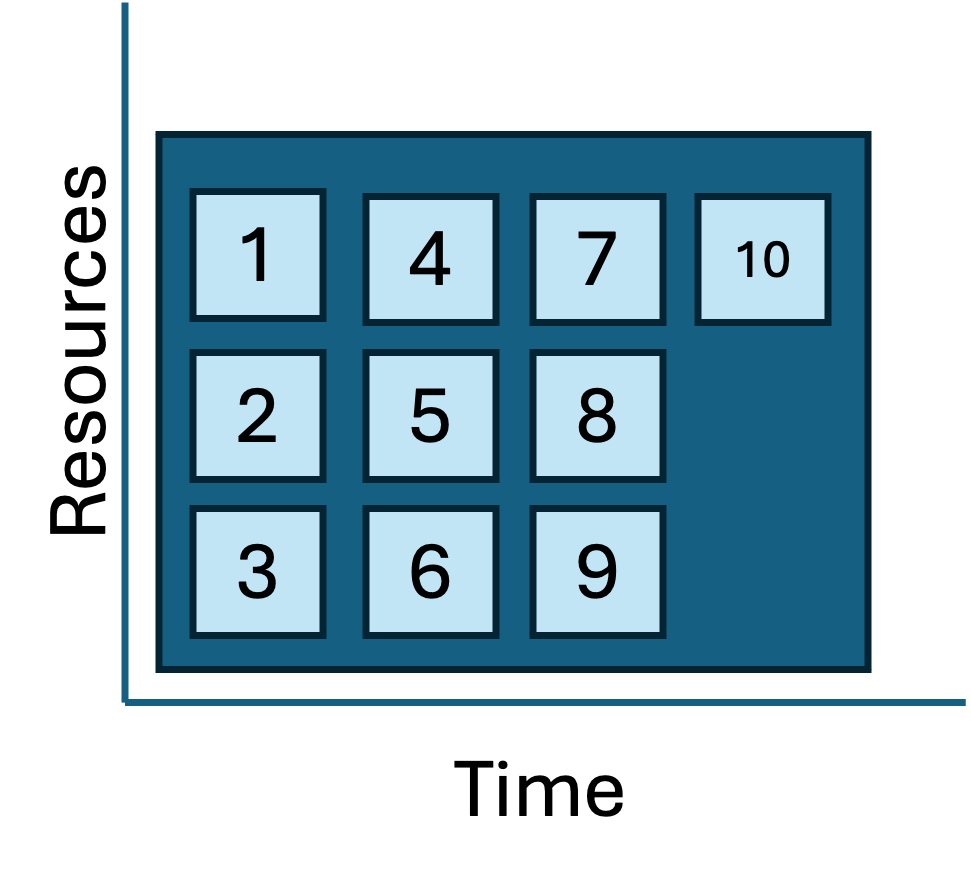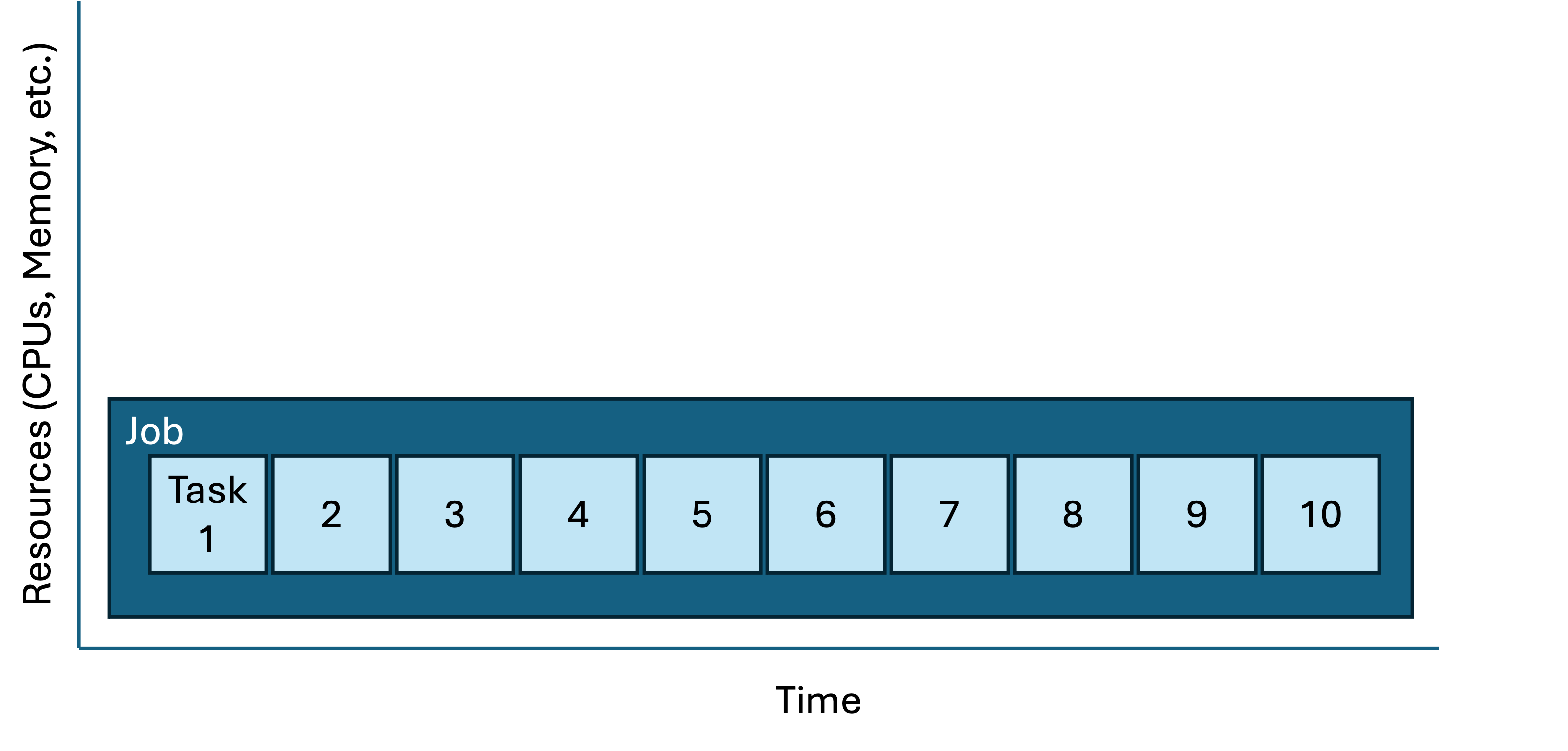 You can represent these graphically by making boxes for each job and their tasks (height = resource request and length = time). In the case above, there are many similar tasks contained in a single job. This diagram is a rough representation of the job/task geometry. This is a useful way of visualizing and comparing approaches; also, the job geometry is critically useful information to the scheduler which is trying to pack everyone’s jobs into the available clusters as neatly/efficiently as possible. |