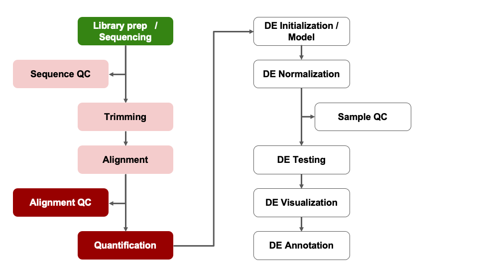LS0tCnRpdGxlOiAiQWxpZ25tZW50IFFDIGFuZCBRdWFudGlmaWNhdGlvbiIKYXV0aG9yOiAiVU0gQmlvaW5mb3JtYXRpY3MgQ29yZSIKb3V0cHV0OgogICAgICAgIGh0bWxfZG9jdW1lbnQ6CiAgICAgICAgICAgIGluY2x1ZGVzOgogICAgICAgICAgICAgICAgaW5faGVhZGVyOiBoZWFkZXIuaHRtbAogICAgICAgICAgICB0aGVtZTogcGFwZXIKICAgICAgICAgICAgdG9jOiB0cnVlCiAgICAgICAgICAgIHRvY19kZXB0aDogNAogICAgICAgICAgICB0b2NfZmxvYXQ6IHRydWUKICAgICAgICAgICAgbnVtYmVyX3NlY3Rpb25zOiBmYWxzZQogICAgICAgICAgICBmaWdfY2FwdGlvbjogdHJ1ZQogICAgICAgICAgICBtYXJrZG93bjogR0ZNCiAgICAgICAgICAgIGNvZGVfZG93bmxvYWQ6IHRydWUKLS0tCjxzdHlsZSB0eXBlPSJ0ZXh0L2NzcyI+CmJvZHl7IC8qIE5vcm1hbCAgKi8KICAgICAgZm9udC1zaXplOiAxNHB0OwogIH0KcHJlIHsKICBmb250LXNpemU6IDEycHQKfQo8L3N0eWxlPgoKSW4gdGhpcyBtb2R1bGUsIHdlIHdpbGwgbGVhcm46CgoqIGFib3V0IHRoZSBNdWx0aVFDIHRvb2wgYW5kIGl0cyBjYXBhYmlsaXRpZXMKKiBob3cgdG8gcnVuIG11bHRpUUMgb24gYSByZW1vdGUgc3lzdGVtCiogaG93IE11bHRpUUMgZ2F0aGVycyBpbmZvcm1hdGlvbiBmb3IgUUMgcHVycG9zZXMKKiBob3cgTXVsdGlRQyBwcmVzZW50cyB0aGUgcmVzdWx0cyBvZiBjdXRhZGFwdCB0cmltbWluZyBhbmQgU1RBUiBhbGlnbm1lbnQKKiBob3cgdG8gY29tYmluZSBnZW5lLWxldmVsIHJlc3VsdHMgaW50byBhIGNvdW50IG1hdHJpeAoKIyBEaWZmZXJlbnRpYWwgRXhwcmVzc2lvbiBXb3JrZmxvdwoKSGVyZSB3ZSB3aWxsIHRha2UgdGhlIHJlc3VsdHMgZnJvbSB0aGUgcHJldmlvdXMgbW9kdWxlIGFuZCBvcGVyYXRlIG9uIHRoZW0gYSBiaXQgZnVydGhlci4gVGhpcyB3aWxsIHdyYXAgdXAgdGhlIHByZWNlZGluZyBleGVyY2lzZXMsIGxlYXZpbmcgdXMgd2VsbC1wb2lzZWQgdG8gYmVnaW4gZGlmZmVyZW50aWFsIGV4cHJlc3Npb24sIHdoaWNoIHdlIHdpbGwgZGlzY3VzcyB0b2RheSBhbmQgdG9tb3Jyb3cuCgohW10oaW1hZ2VzL3dheWZpbmRlci93YXlmaW5kZXItQWxpZ25tZW50X1FDX2FuZF9RdWFudGlmaWNhdGlvbi5wbmcpCjxicj4KPGJyPgo8YnI+Cjxicj4KCiMjIEFsaWdubWVudCBTdGF0aXN0aWNzIHdpdGggTXVsdGlRQwoKQWZ0ZXIgYWxpZ25pbmcgcmVhZHMgaXQgaXMgb2Z0ZW4gaGVscGZ1bCB0byBrbm93IGhvdyBtYW55IHJlYWRzIHdlcmUgdW5pcXVlbHkgYWxpZ25lZCwgbWFwcGVkIHRvIG11bHRpcGxlIGxvY2ksIG9yIG5vdCBtYXBwZWQgYXQgYWxsLiBUaGUgYHNhbXBsZV9OTG9nLmZpbmFsLm91dGAgZmlsZSB3aGljaCBpcyBvdXRwdXQgYWxvbmdzaWRlIHRoZSBhbGlnbm1lbnRzIGluIGBzYW1wbGVfTi50ZW1wL2AgZm9sZGVyICh3ZSB1c2VkIHRoZSBgLS1rZWVwLWludGVybWVkaWF0ZS1maWxlc2AgZmxhZyksIHJlcG9ydHMgdGhpcyBpbmZvcm1hdGlvbjoKCmBgYAogICAgICAgICAgICAgICAgICAgICAgICAgICAgICAgICBTdGFydGVkIGpvYiBvbiB8CU9jdCAwMiAxMzowOToyMwogICAgICAgICAgICAgICAgICAgICAgICAgICAgIFN0YXJ0ZWQgbWFwcGluZyBvbiB8CU9jdCAwMiAxMzowOTo1MQogICAgICAgICAgICAgICAgICAgICAgICAgICAgICAgICAgICBGaW5pc2hlZCBvbiB8CU9jdCAwMiAxMzoxMjo0NwogICAgICAgTWFwcGluZyBzcGVlZCwgTWlsbGlvbiBvZiByZWFkcyBwZXIgaG91ciB8CTIzOC44MgoKICAgICAgICAgICAgICAgICAgICAgICAgICBOdW1iZXIgb2YgaW5wdXQgcmVhZHMgfAkxMTY3NTUwNAogICAgICAgICAgICAgICAgICAgICAgQXZlcmFnZSBpbnB1dCByZWFkIGxlbmd0aCB8CTE0NgogICAgICAgICAgICAgICAgICAgICAgICAgICAgICAgICAgICBVTklRVUUgUkVBRFM6CiAgICAgICAgICAgICAgICAgICBVbmlxdWVseSBtYXBwZWQgcmVhZHMgbnVtYmVyIHwJMTA2MDk1OTEKICAgICAgICAgICAgICAgICAgICAgICAgVW5pcXVlbHkgbWFwcGVkIHJlYWRzICUgfAk5MC44NyUKICAgICAgICAgICAgICAgICAgICAgICAgICBBdmVyYWdlIG1hcHBlZCBsZW5ndGggfAkxNDYuMzcKICAgICAgICAgICAgICAgICAgICAgICBOdW1iZXIgb2Ygc3BsaWNlczogVG90YWwgfAkyNzU1NTQzCiAgICAgICAgICAgIE51bWJlciBvZiBzcGxpY2VzOiBBbm5vdGF0ZWQgKHNqZGIpIHwJMjczNDczMAogICAgICAgICAgICAgICAgICAgICAgIE51bWJlciBvZiBzcGxpY2VzOiBHVC9BRyB8CTI3Mzk2OTcKICAgICAgICAgICAgICAgICAgICAgICBOdW1iZXIgb2Ygc3BsaWNlczogR0MvQUcgfAkxMzIwNAogICAgICAgICAgICAgICAgICAgICAgIE51bWJlciBvZiBzcGxpY2VzOiBBVC9BQyB8CTE3NDQKICAgICAgICAgICAgICAgTnVtYmVyIG9mIHNwbGljZXM6IE5vbi1jYW5vbmljYWwgfAk4OTgKICAgICAgICAgICAgICAgICAgICAgIE1pc21hdGNoIHJhdGUgcGVyIGJhc2UsICUgfAkwLjE4JQogICAgICAgICAgICAgICAgICAgICAgICAgRGVsZXRpb24gcmF0ZSBwZXIgYmFzZSB8CTAuMDElCiAgICAgICAgICAgICAgICAgICAgICAgIERlbGV0aW9uIGF2ZXJhZ2UgbGVuZ3RoIHwJMS42MAogICAgICAgICAgICAgICAgICAgICAgICBJbnNlcnRpb24gcmF0ZSBwZXIgYmFzZSB8CTAuMDElCiAgICAgICAgICAgICAgICAgICAgICAgSW5zZXJ0aW9uIGF2ZXJhZ2UgbGVuZ3RoIHwJMS4yOQogICAgICAgICAgICAgICAgICAgICAgICAgICAgIE1VTFRJLU1BUFBJTkcgUkVBRFM6CiAgICAgICAgTnVtYmVyIG9mIHJlYWRzIG1hcHBlZCB0byBtdWx0aXBsZSBsb2NpIHwJNTk5OTE1CiAgICAgICAgICAgICAlIG9mIHJlYWRzIG1hcHBlZCB0byBtdWx0aXBsZSBsb2NpIHwJNS4xNCUKICAgICAgICBOdW1iZXIgb2YgcmVhZHMgbWFwcGVkIHRvIHRvbyBtYW55IGxvY2kgfAkxMjc4NgogICAgICAgICAgICAgJSBvZiByZWFkcyBtYXBwZWQgdG8gdG9vIG1hbnkgbG9jaSB8CTAuMTElCiAgICAgICAgICAgICAgICAgICAgICAgICAgICAgICAgICBVTk1BUFBFRCBSRUFEUzoKICBOdW1iZXIgb2YgcmVhZHMgdW5tYXBwZWQ6IHRvbyBtYW55IG1pc21hdGNoZXMgfAkyMDM4MQogICAgICAgJSBvZiByZWFkcyB1bm1hcHBlZDogdG9vIG1hbnkgbWlzbWF0Y2hlcyB8CTAuMTclCiAgICAgICAgICAgIE51bWJlciBvZiByZWFkcyB1bm1hcHBlZDogdG9vIHNob3J0IHwJMzg5OTYwCiAgICAgICAgICAgICAgICAgJSBvZiByZWFkcyB1bm1hcHBlZDogdG9vIHNob3J0IHwJMy4zNCUKICAgICAgICAgICAgICAgIE51bWJlciBvZiByZWFkcyB1bm1hcHBlZDogb3RoZXIgfAk0Mjg3MQogICAgICAgICAgICAgICAgICAgICAlIG9mIHJlYWRzIHVubWFwcGVkOiBvdGhlciB8CTAuMzclCiAgICAgICAgICAgICAgICAgICAgICAgICAgICAgICAgICBDSElNRVJJQyBSRUFEUzoKICAgICAgICAgICAgICAgICAgICAgICBOdW1iZXIgb2YgY2hpbWVyaWMgcmVhZHMgfAkwCiAgICAgICAgICAgICAgICAgICAgICAgICAgICAlIG9mIGNoaW1lcmljIHJlYWRzIHwJMC4wMCUKYGBgCgojIE11bHRpUUMKCldoaWxlIHRoZSBpbmZvcm1hdGlvbiBpcyBpbmNyZWRpYmx5IHVzZWZ1bCwgaXQgY2FuIGJlIHRlZGlvdXMgdG8gbG9vayBhdCB0aGUgcmVwb3J0IGZvciBlYWNoIHNhbXBsZSBzZXBhcmF0ZWx5LCB3aGlsZSBrZWVwaW5nIHRyYWNrIG9mIHdoYXQgdHJlbmRzIGVtZXJnZS4gSXQgd291bGQgYmUgbXVjaCBlYXNpZXIgdG8gbG9vayBhdCBhbGwgdGhlIGRhdGEgY29tcGlsZWQgaW50byBhIHNpbmdsZSByZXBvcnQuIFtNdWx0aVFDXShodHRwczovL211bHRpcWMuaW5mby8pIGlzIGEgdG9vbCB0aGF0IGRvZXMgZXhhY3RseSB0aGlzLgoKTXVsdGlRQyBpcyBkZXNpZ25lZCB0byBpbnRlcnByZXQgYW5kIGFnZ3JlZ2F0ZSByZXBvcnRzIGZyb20gW3ZhcmlvdXMgdG9vbHNdKGh0dHBzOi8vbXVsdGlxYy5pbmZvLyNzdXBwb3J0ZWQtdG9vbHMpIGFuZCBvdXRwdXQgYSBzaW5nbGUgcmVwb3J0IGFzIGFuIEhUTUwgZG9jdW1lbnQuCgojIyBNdWx0aVFDIERldGFpbHMKCk11bHRpUUMncyBtYWluIG91dHB1dCBpcyB0aGUgcmVwb3J0IGZpbGUgaW4gSFRNTCBmb3JtYXQuIFRoaXMgY2FuIGJlIHZpZXdlZCBpbiBhIHdlYiBicm93c2VyLiBBZGRpdGlvbmFsbHksIGl0IGNyZWF0ZXMgYSBgZGF0YWAgZGlyZWN0b3J5IHdpdGggdGV4dCBmaWxlcyBjb250YWluaW5nIHRoZSBkYXRhIHRoYXQgTXVsdGlRQyBnYXRoZXJlZCBkdXJpbmcgaXRzIGV4ZWN1dGlvbiAtIHRoaXMgc2FtZSBkYXRhIGlzIHdoYXQgaXMgc2hvd24gaW4gdGhlIHJlcG9ydC4KCkdpdmVuIGFuIG91dHB1dCBkaXJlY3Rvcnkgb3V0X211bHRpcWMsIHdlIHNob3VsZCBzZWUgc29tZXRoaW5nIGxpa2UgdGhlIGZvbGxvd2luZzoKCiAgICAjIGRpcmVjdG9yeSBvZiBtdWx0aXFjIGRhdGEgZmlsZXMKICAgIG91dF9tdWx0aXFjL211bHRpcWNfZGF0YS9tdWx0aXFjLmxvZwogICAgb3V0X211bHRpcWMvbXVsdGlxY19k