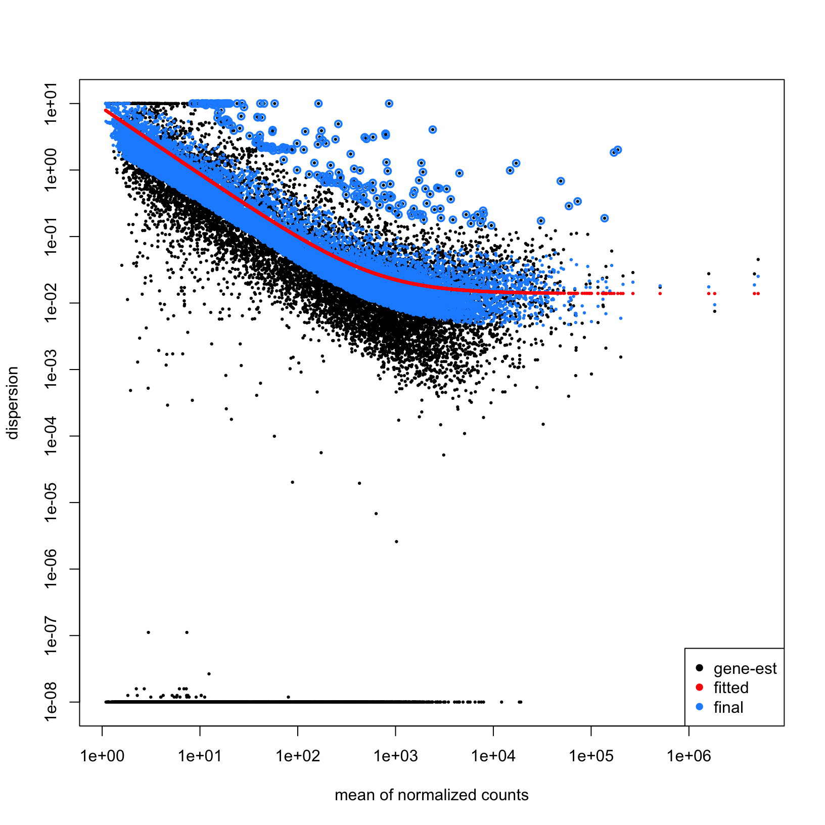 dispersion plot with the plotDispEsts(dds)